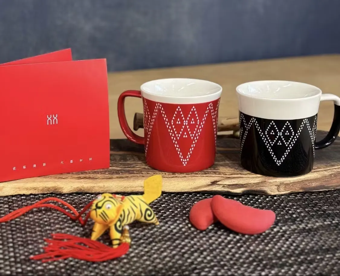 台湾原住民族の中でも特に紡績品が素晴らしく、祝福の意味も一緒に織り込んでいると伝わるサイシャット族の織物柄をモチーフにした緻密なデザインです。縁起物でもあり、常に喜びや幸運に包まれることを願って作られています。釉薬を施す技術は台湾随一とも言われているメーカーさん渾身の作品です。この想いの詰まったマグカップを2客セットでお送りいたします。原住民族の織物柄を取り入れたこのマグカップは、日本では流通していない品物であり、日々の生活のなかで台湾文化に触れられる一品です。