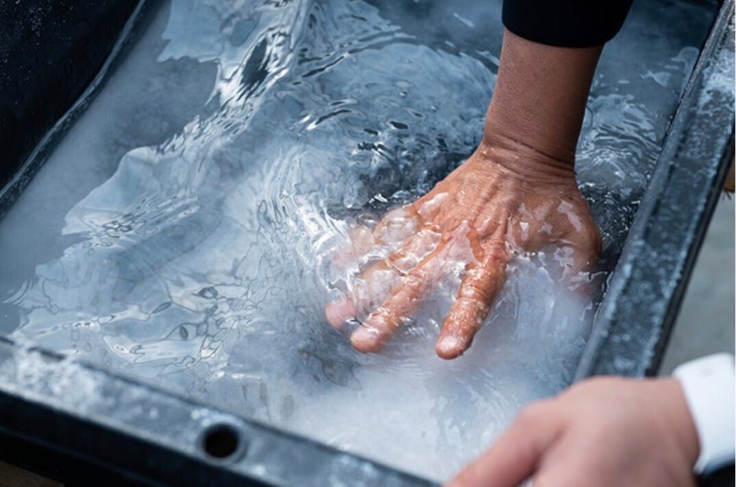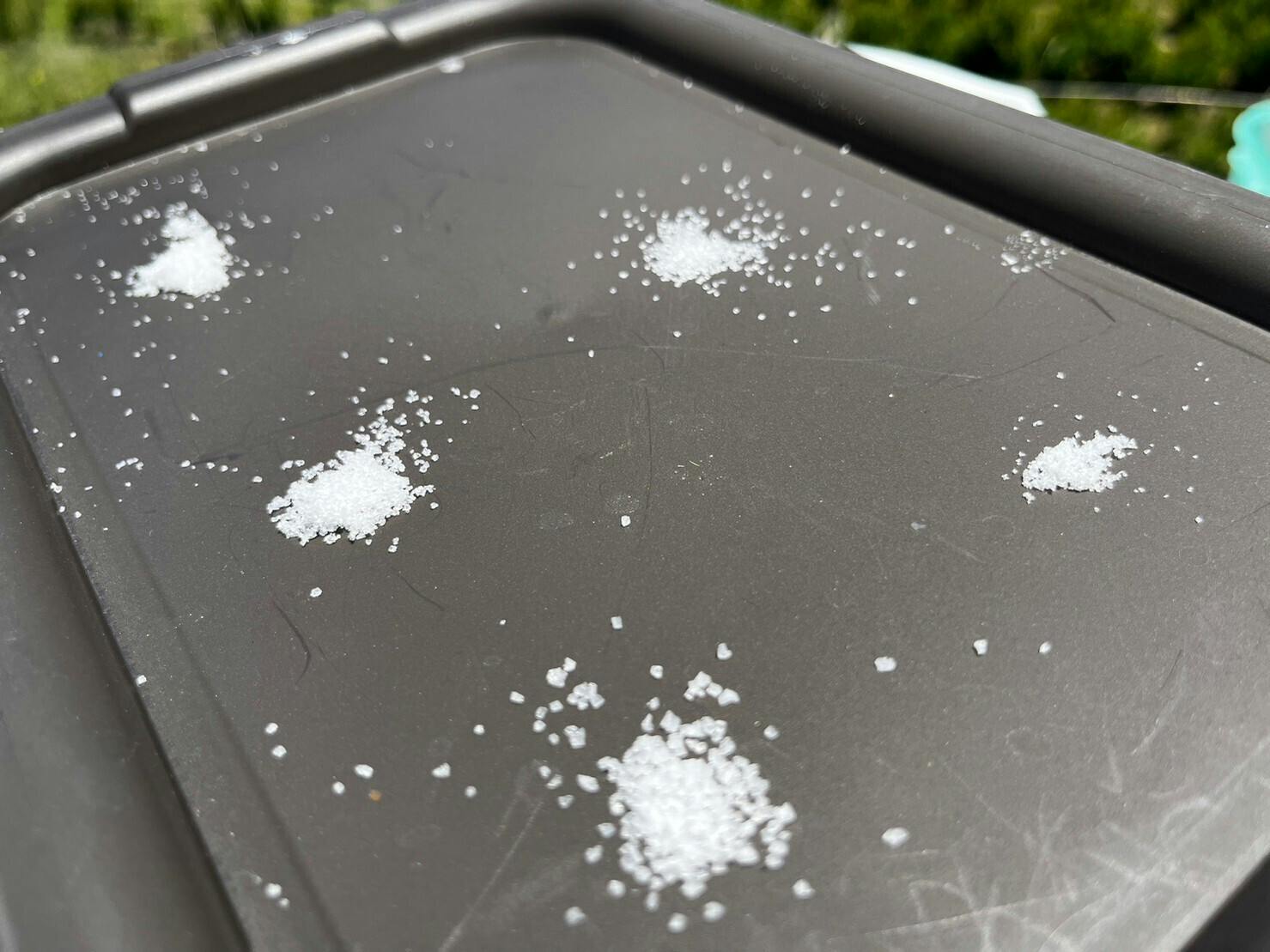 容器の中で固まってきた塩を手もみで一定の大きさに調整していきます。細かい作業を重ねながら、大粒からパウダー状までを幅広く作り分けていきます。
