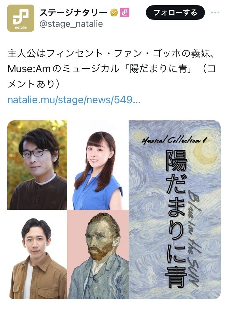 遅ればせながら、Muse:Am旗揚げ公演「陽だまりに青」が全公演終了致しました。皆様にクラウドファンディングにてご支援頂けたことにより、良い稽古環境・本番環境を維持することができ、作品作りを深めることができました。そして、ご来場頂いた多くの方に作品を届けることができたことをとても嬉しく思います。まだまだ至らぬところが多い新団体の活動の第一歩を温かく見守って頂けて、キャスト・スタッフ一同感謝の気持ちでいっぱいです。応援・お力添え、本当にありがとうございました!これからもより良いオリジナルミュージカル作品をお届けできるよう、精進してまいりますので、Muse:Amをどうぞよろしくお願いいたします。>>公演の上演写真はこちらからチェック!