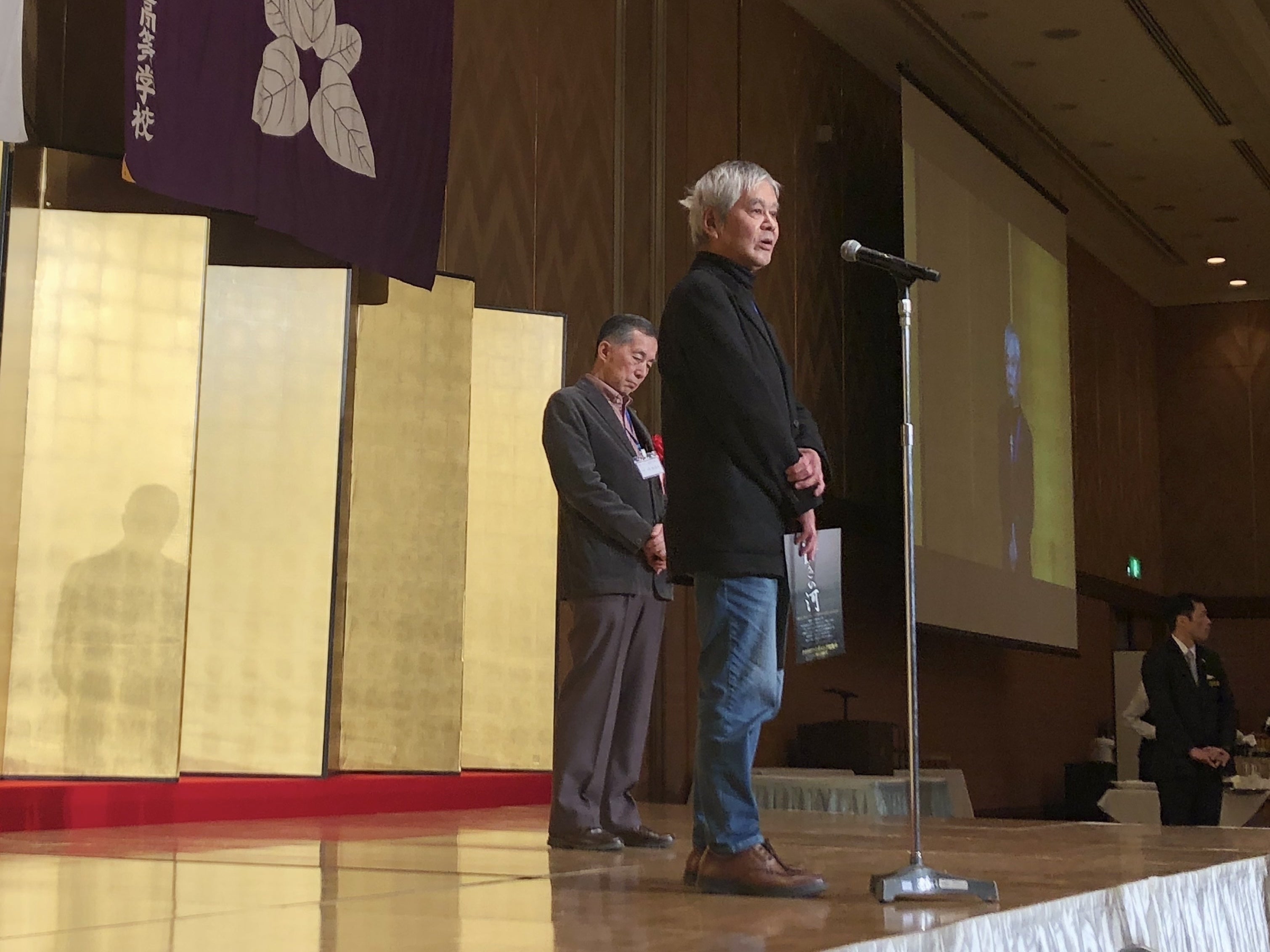 前もって浜田東京会長に会場でのチラシ配布は、承認して貰っていたのですが、浜田氏の来賓挨拶の中でいきなり壇上に呼ばれて会場でのスピーチを振られ、戸惑いましたが何とか映画のPRとクラファンのアピールも出来ました。守信鯉城同窓会会長は勿論、会友が今映画製作をしているということで、会場で多くの人から声を掛けられたり、二次会では同期からの質問攻めに遭い、映画・クラファンのことをさらにPR出来ました。皆さん、同窓が映画製作をしていること、広島も大雨災害に遭っているので今回の映画のテーマ、そして出演メンバーに関心を寄せてくれています。