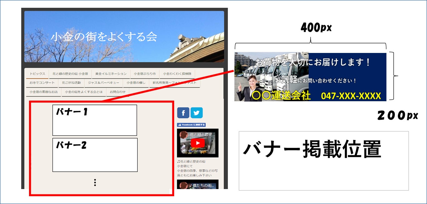 ・小金の街をよくする会の公式サイトに1年間バナー掲載し宣伝します。