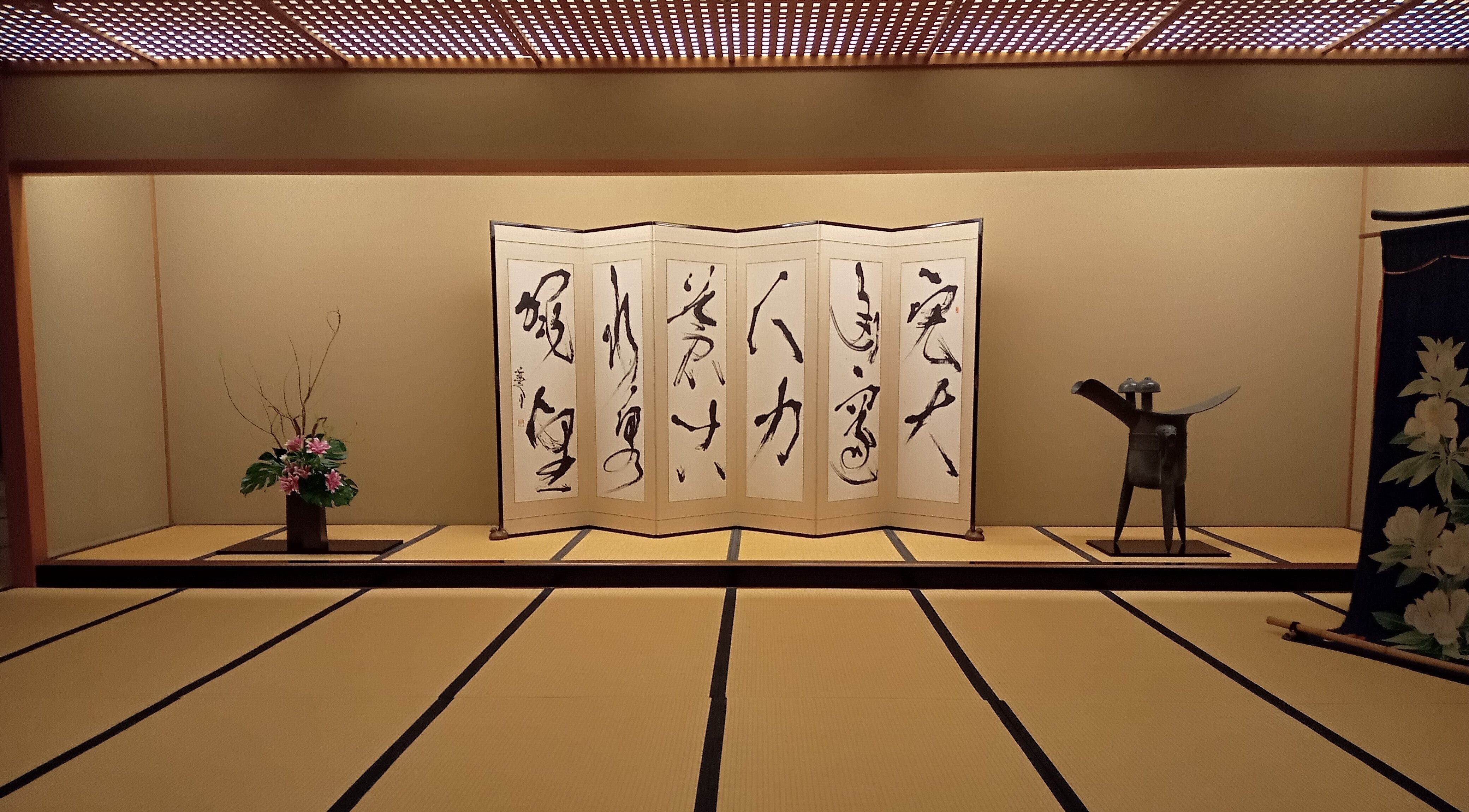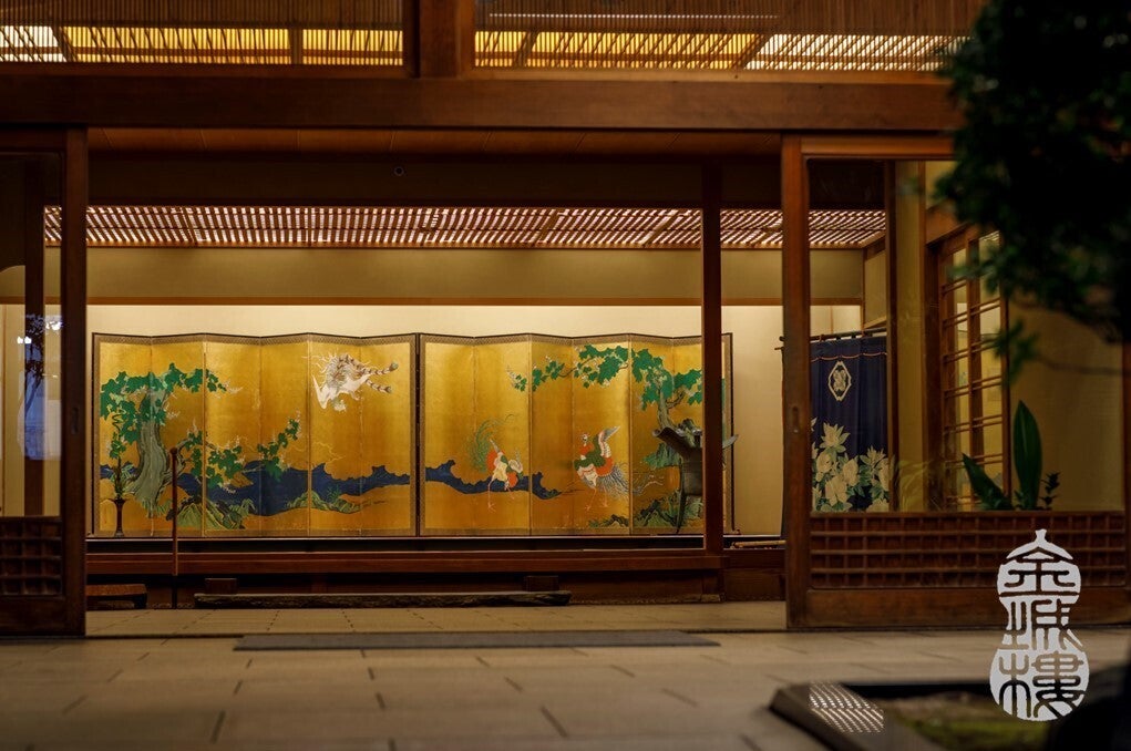 日本古来の木造建築の館内に入っていただくと、兼六園の名前の由来であり六つの景観「六勝」が書かれた、書道家・横西霞亭(よこにしかてい)作の屏風や、加賀友禅の巨匠である成竹登茂男(なるたけともお)が手掛けた几帳など、調度品とともにお迎え致します。