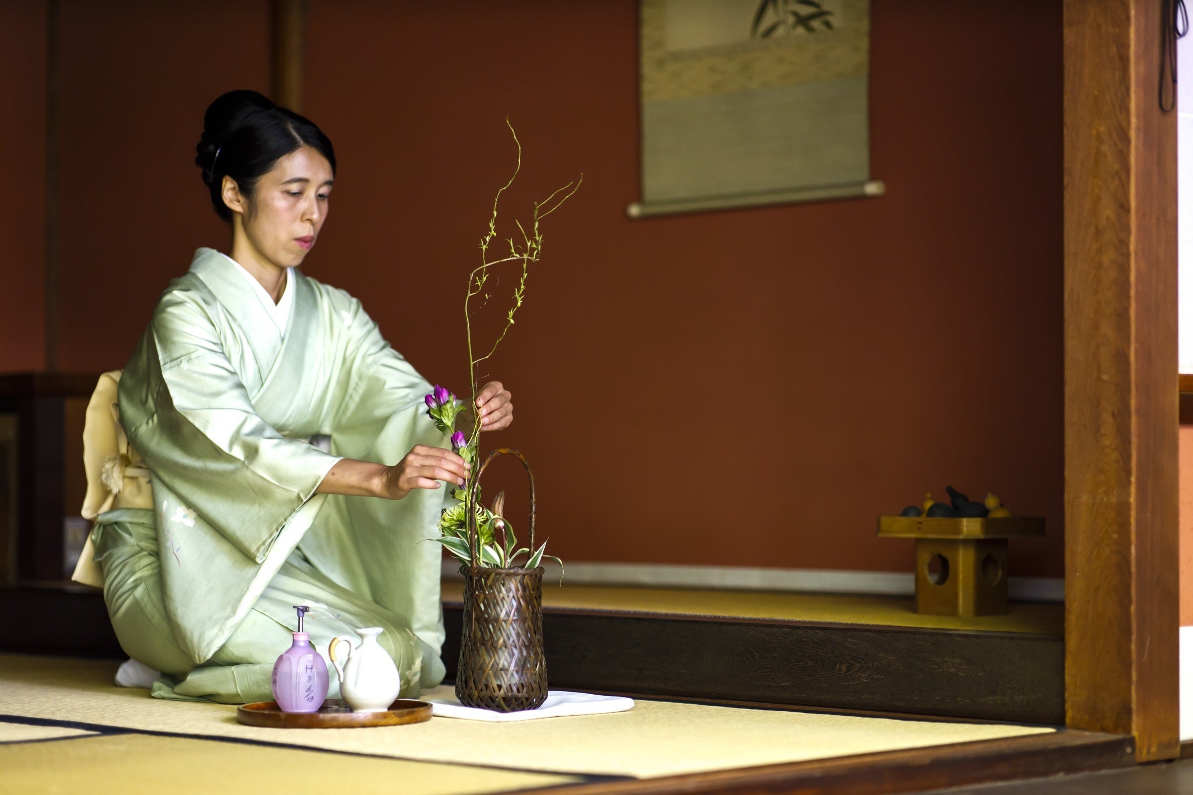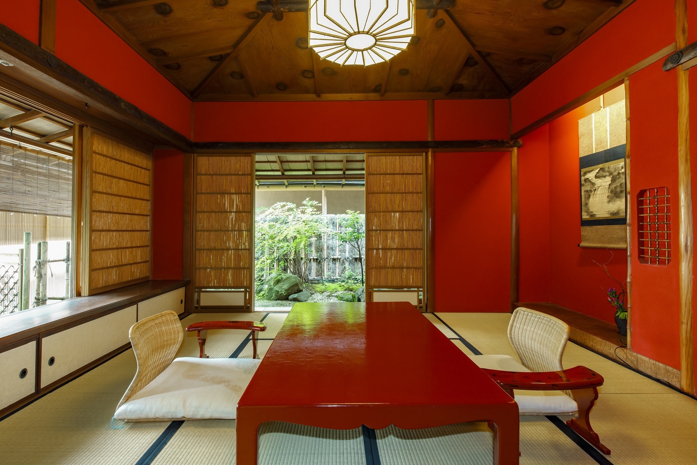 空間に彩りを添える朱塗りの座卓は漆塗りで、記憶に残る一瞬を演出します。