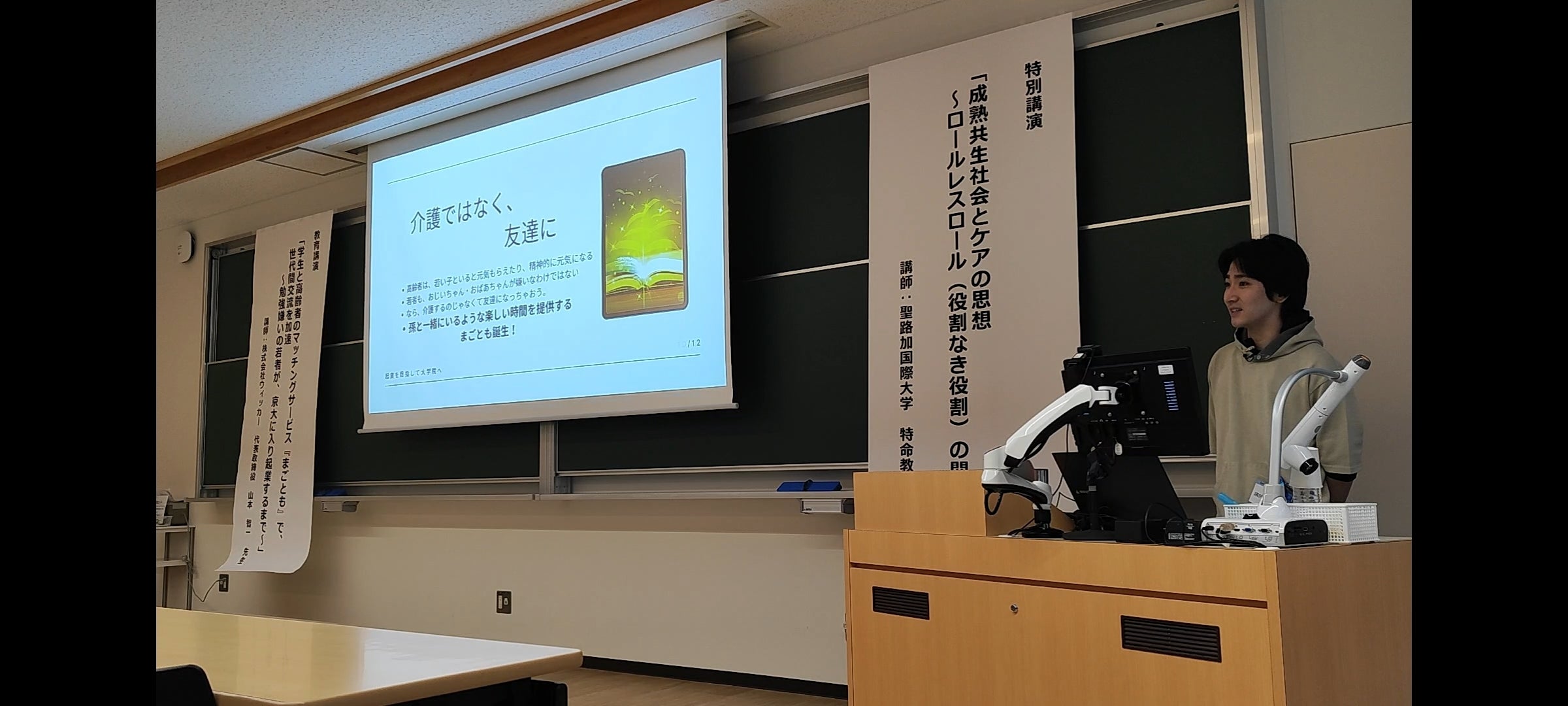 全てのオーディエンスに満足してもらえるように、どのような経緯で1人の学生が世代間交流サービス『まごとも』を生み出したのかを講演してきました。