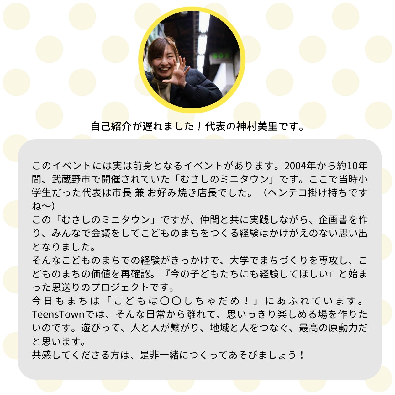 私達は武蔵野市に在住・在学の大学生が立ち上げ、活動5年目になるボランティア団体です。 19人の運営メンバーに加え、多数のボランティアメンバーの協力のもと、 ”TeensTown むさしの”イベントを年一回開催することを中心に活動しています。昨年のクラウドファンディングをはじめ、多くの皆様のご協力や応援のお陰で、今年もコピスさんにて開催できることになりました。