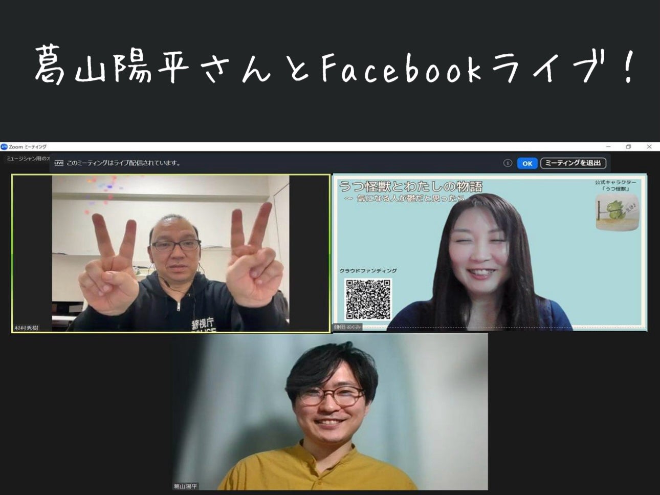 ファーストステージ達成記念葛山陽平さんとFacebookライブ開催!!#映画「うつ怪獣とわたしの物語」の真人の友人、佐藤役を演じていただきます。60分葛山陽平さんとお話して驚いたのは、むかしは人前で緊張していたそうです!!本読みで鎌田は葛山さんの演技を見惚れていたのでさらにびっくりでした!俳優、シンガーソングライター、脚本家、そしてイラストもかいてしまう。多彩な葛山さん。佐藤役を受けていただいたときの心境を「佐藤が実在の人物だと分かった時により気持ちが入った」とお話してくださいました。ますます、映画作成が楽しみです。葛山陽平さんありがとうございます!次回2/27Facebookライブ21:00~22:00のゲストは真人役の五十嵐洋さんです。お楽しみに。https://www.facebook.com/events/442293758317046/