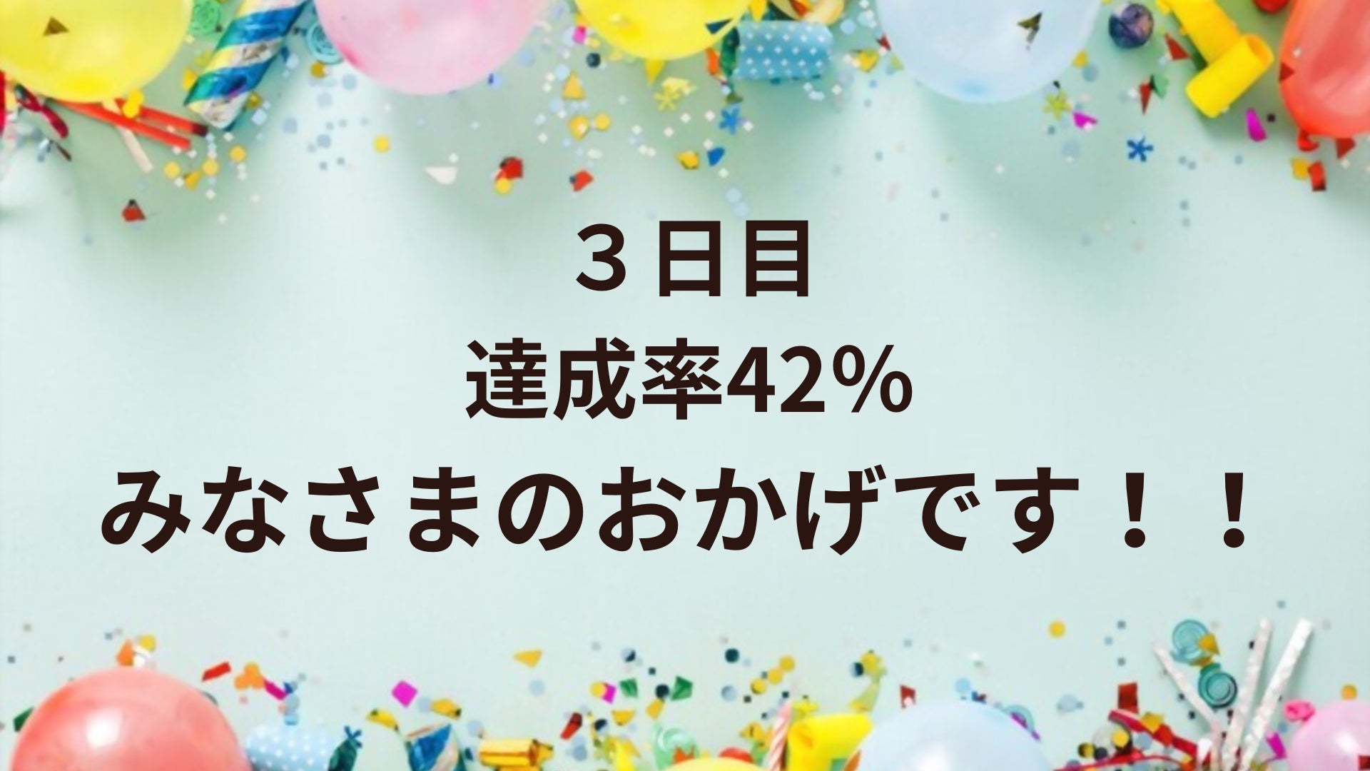 3日目にして達成率42%応援して下さる、みなさまのおかげです!!大感謝、大感謝でございます。どうか、温かく見守りつづけてください。