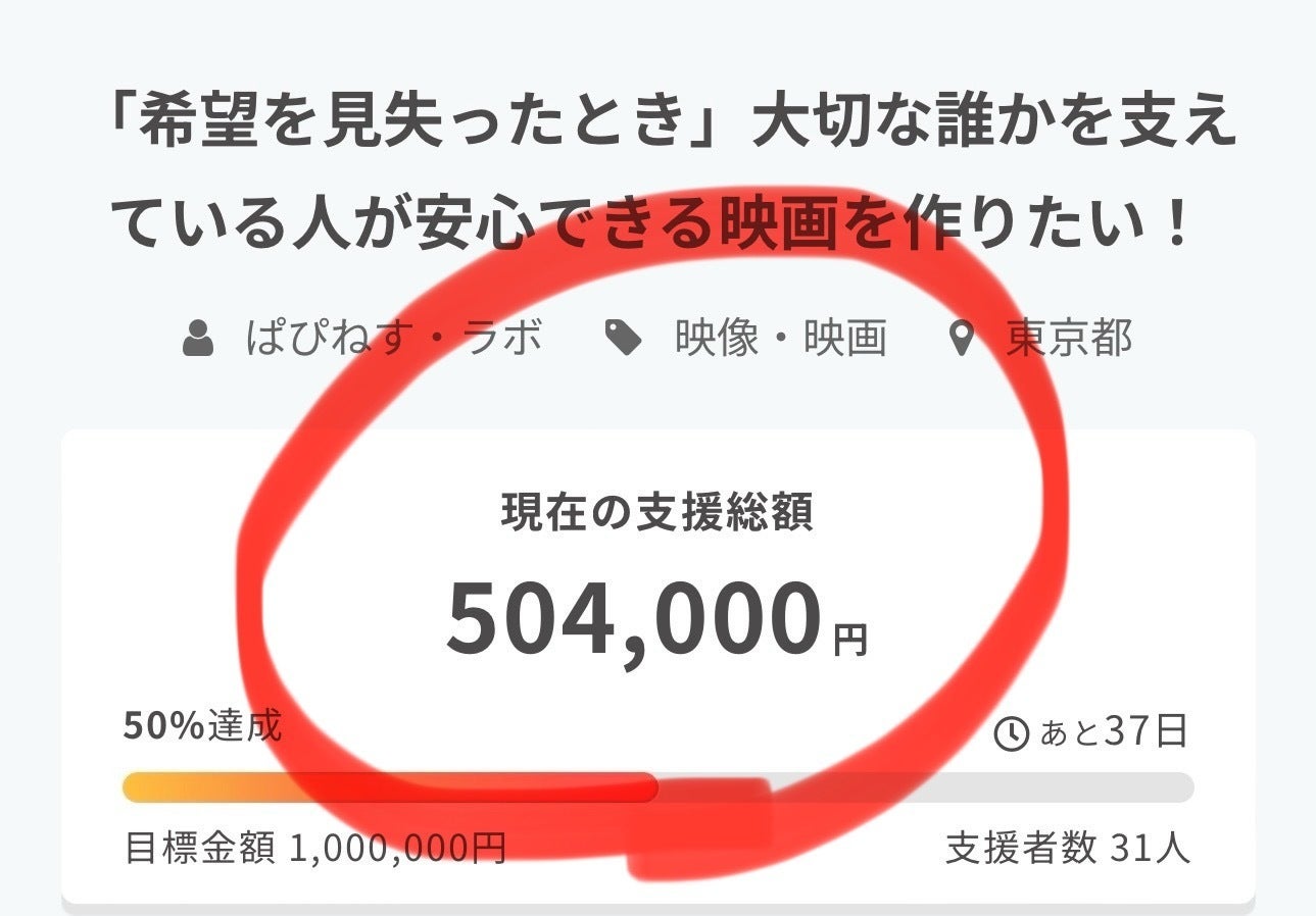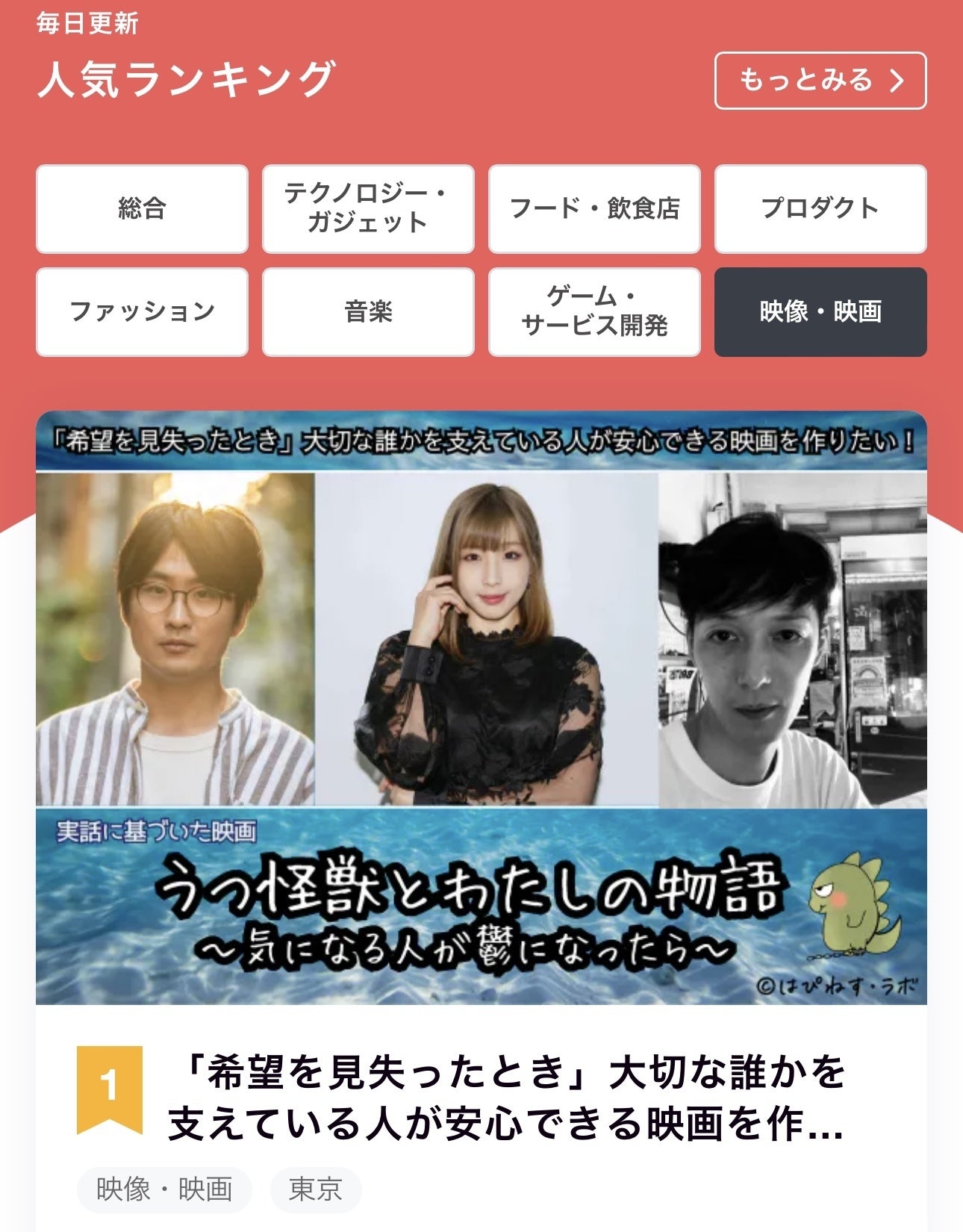 1位になってます!!毎日人気ランキング映像映画カテゴリーで1位です!!ご支援者さま、シェアしていただいている方々感謝申し上げます。この映画制作が滞りなくできるように引き続き応援お願いします。