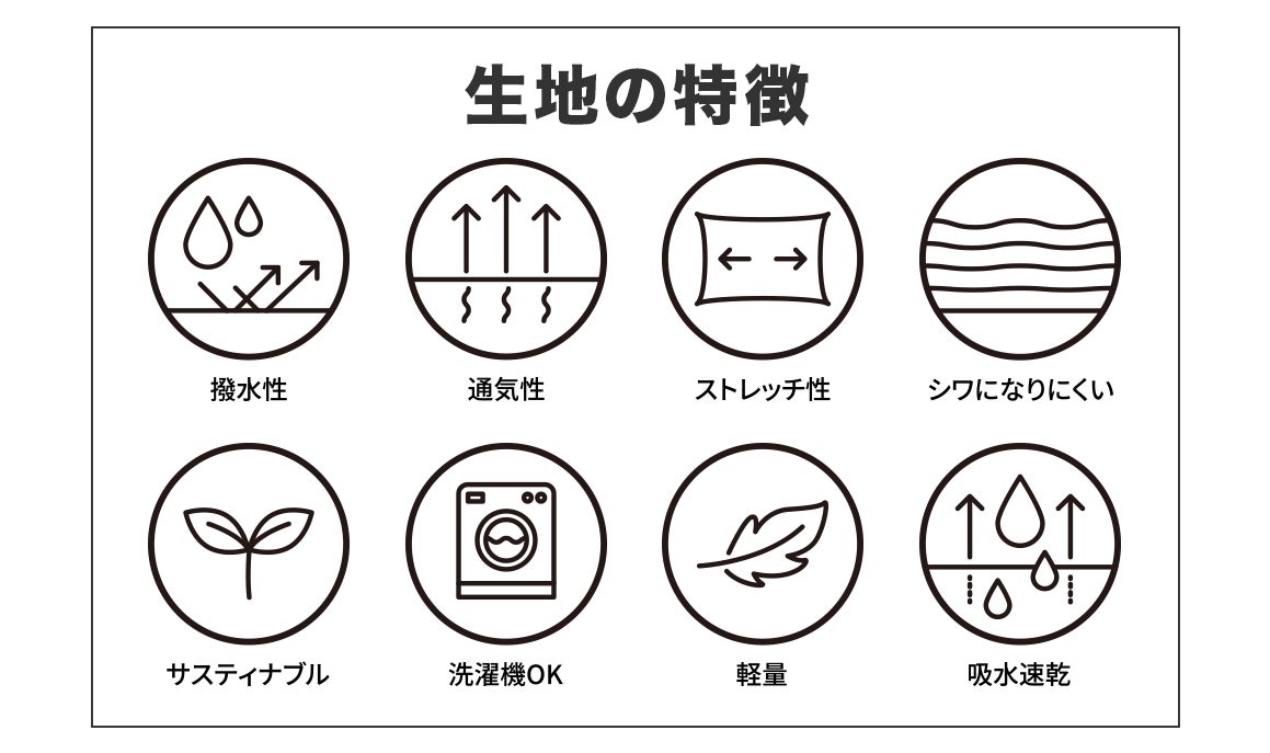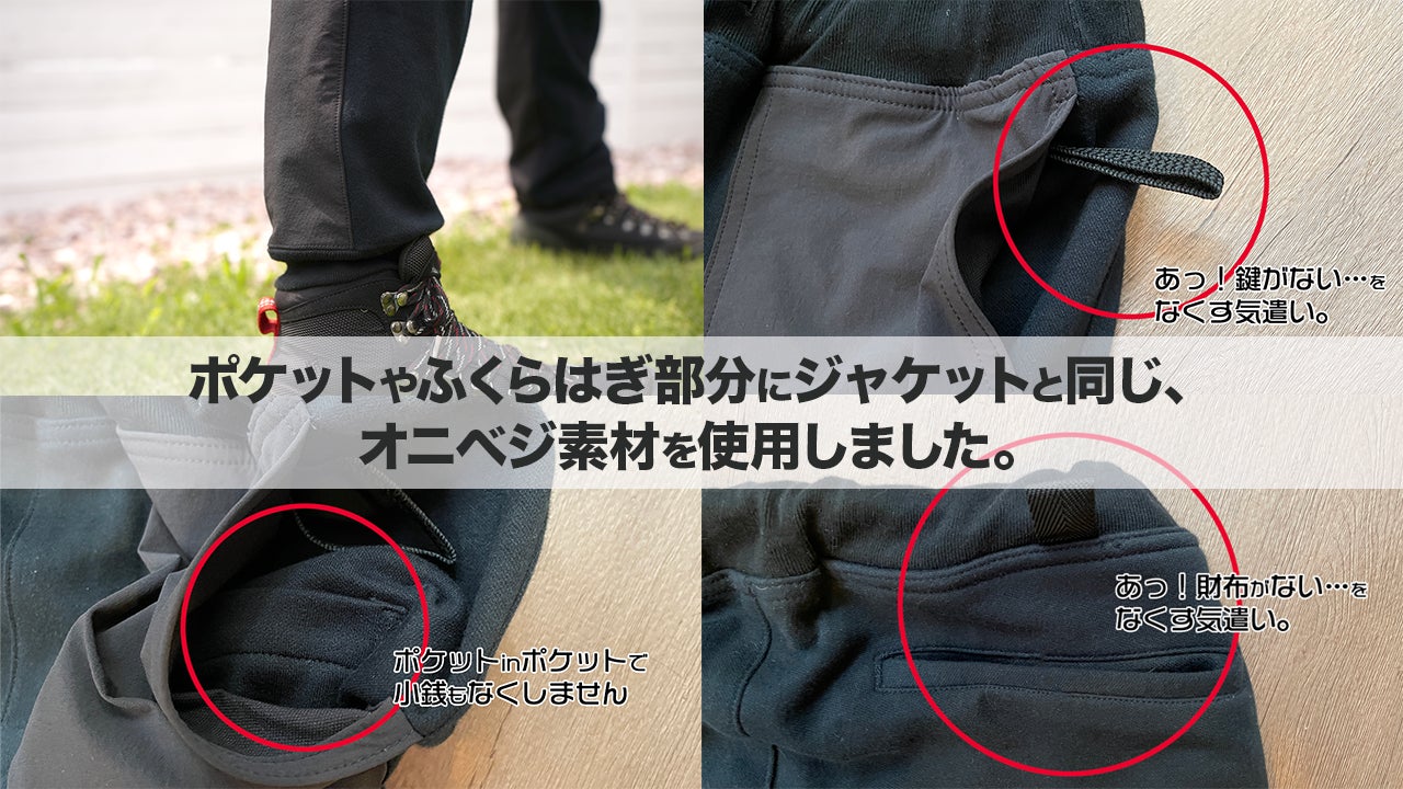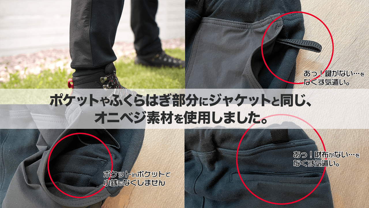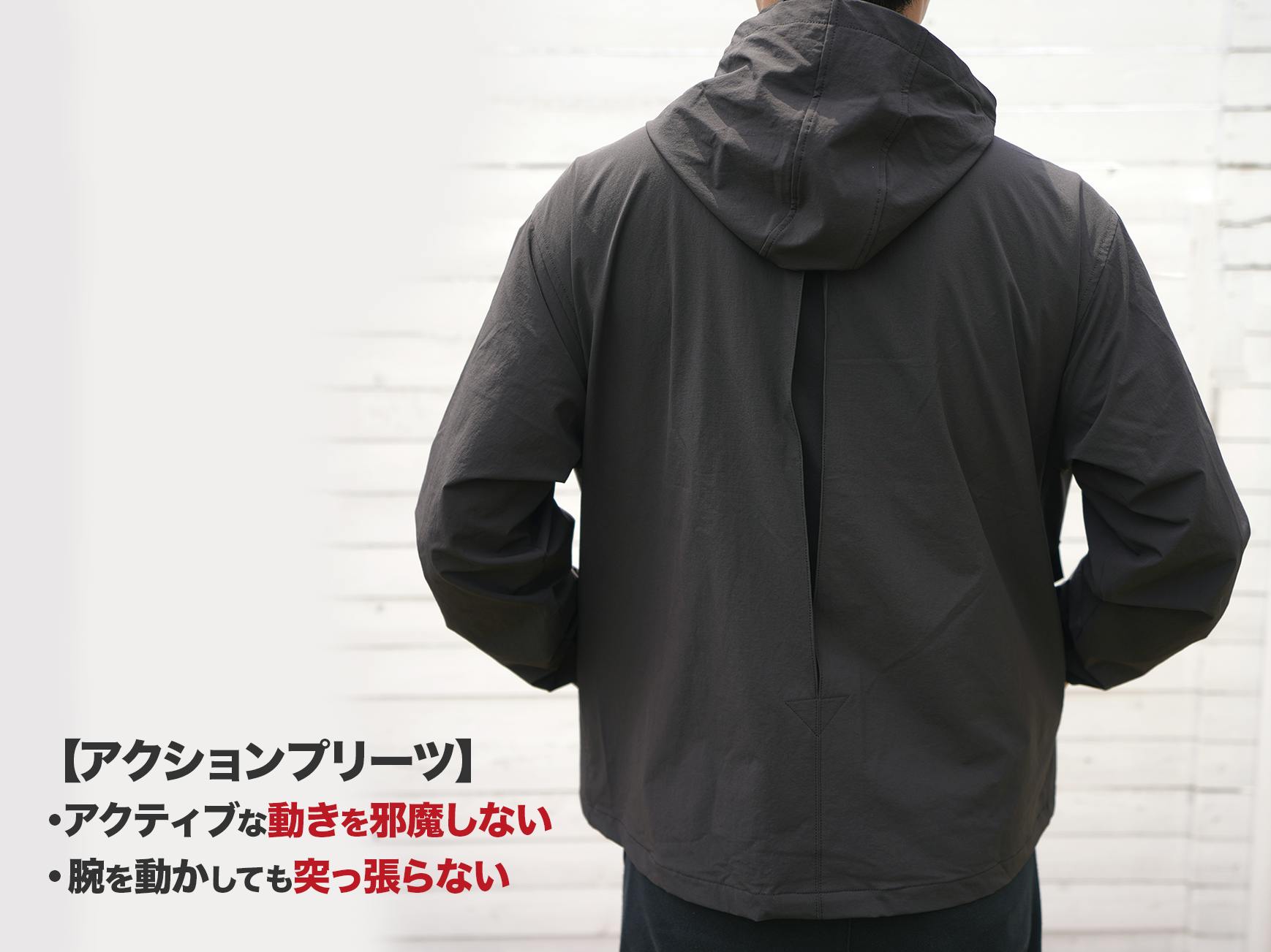 アクティブな動きも邪魔しない背面にアクションフリップを採用し、ストレッチ性と急な雨でも安心の撥水性のある環境に配慮したオニベジ素材を使用しました。