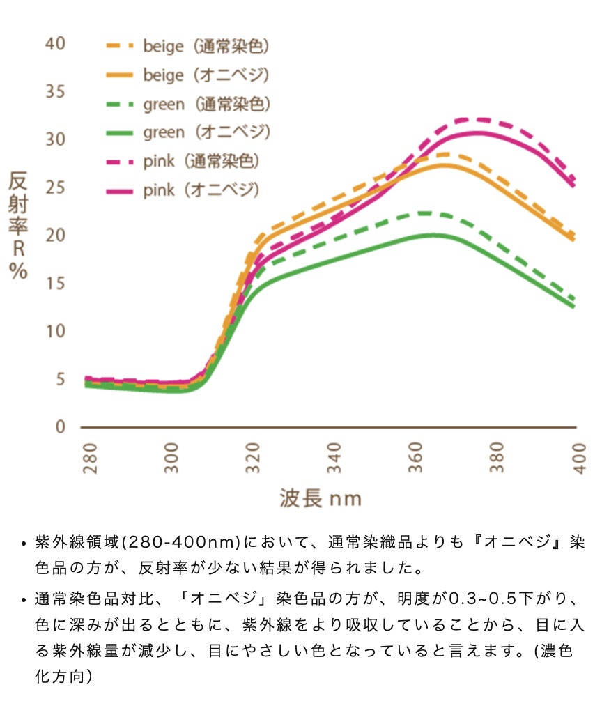 Onibegie®は、タマネギの皮をはじめ、オリーブの葉、ぶどうの絞り殼、竹炭などから生まれました。自然由来の色は紫外線量を反射しにくく、目に入る紫外線が少ないのも特徴です。そのためOnibegieは、目にも負担をかけない素材と言えます。