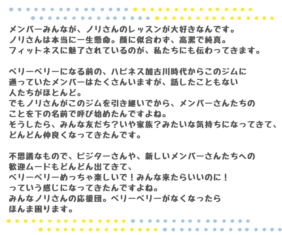 もう、今これ書いてたらまた泣けてきました……。普通のジムでは⾒ることの出来ない非日常かと思うくらいの優しさ、温かさを感じられる空間や⼈が、僕にとってのベリーベリーです。だから、どんなに経営が厳しくても、ベリーベリーを継続させるためにバイトが続いても、毎日が楽しいんです!