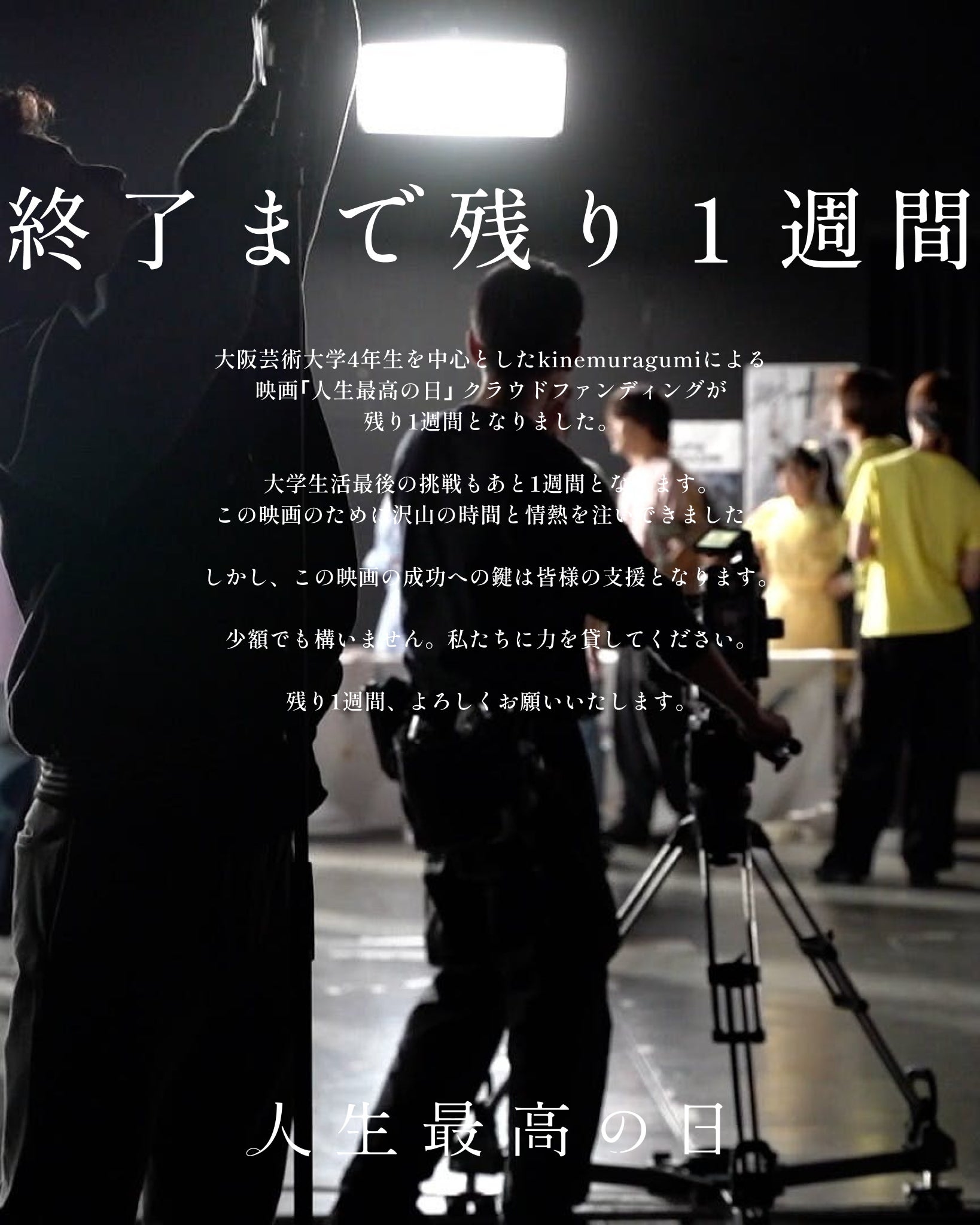 大阪芸術大学4年生を中心とした約50人の大学生たちで挑む映画「人生最高の日」製作プロジェクト!チームとして最後となるこのプロジェクトを実現し、多くの人たちを楽しませられる作品を完成させたいです!私たちの挑戦を、応援していただけると幸いです!