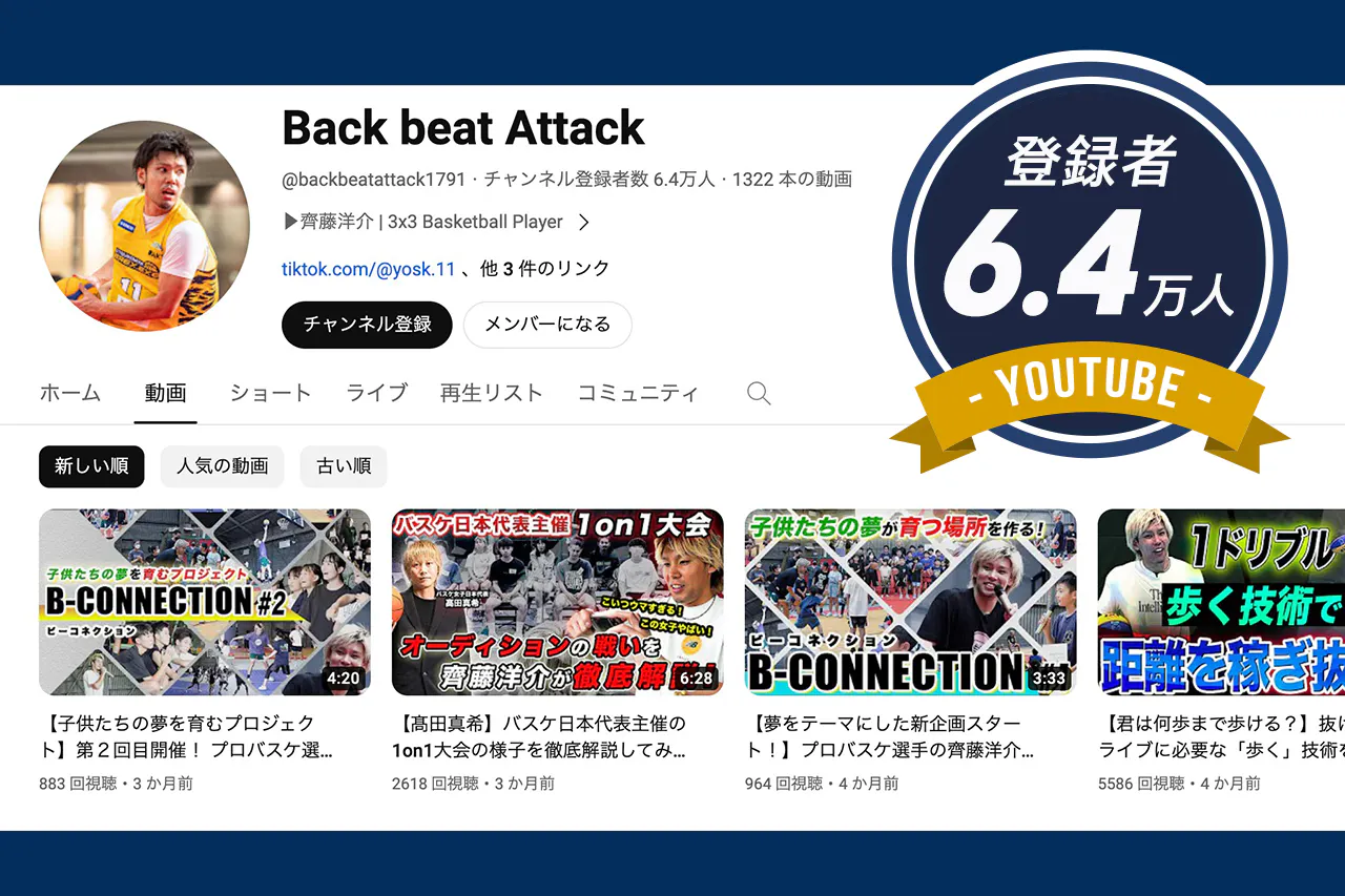 また、バスケ選手として活動する傍らYouTubeチャンネル『Back beat Attack』を運営し、様々なバスケスキルを発信しています。