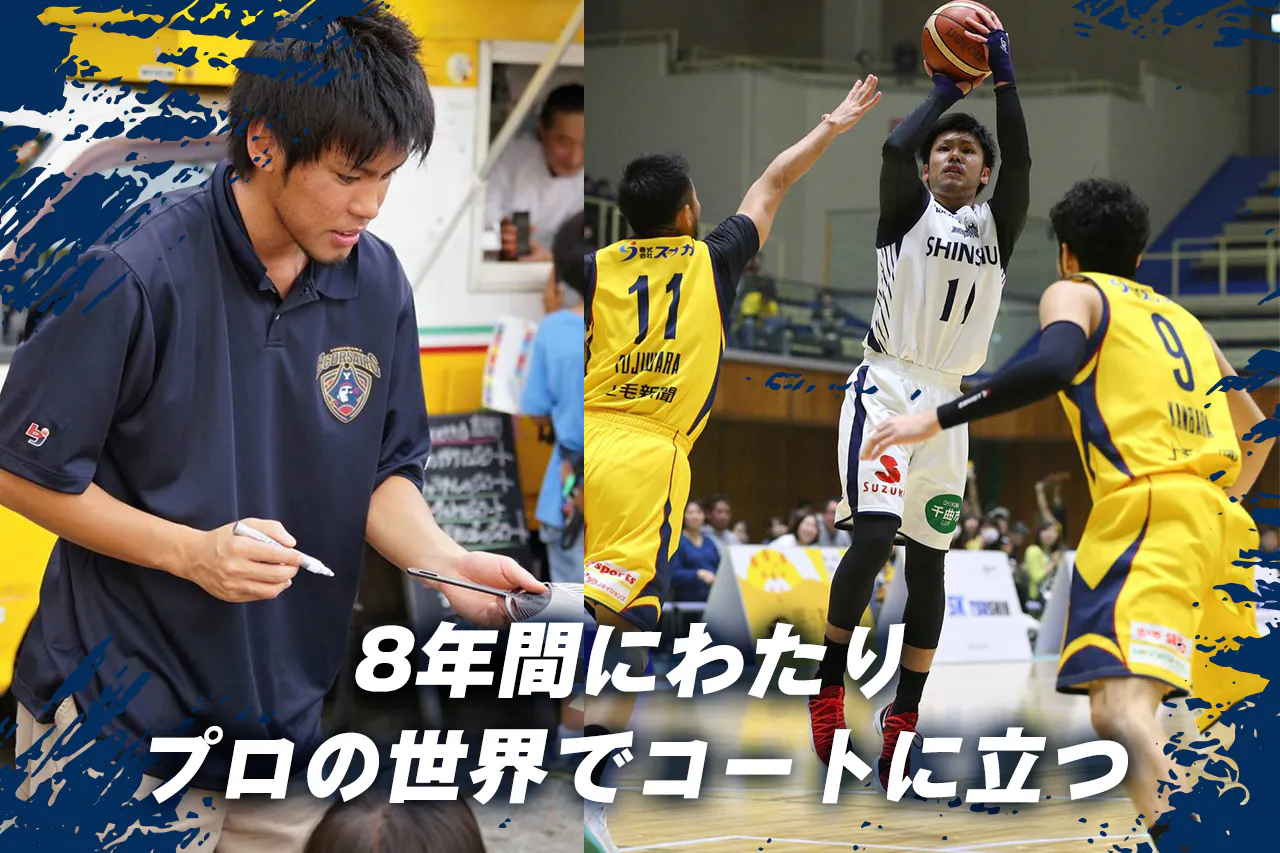 NBDLではTGI D-RISE、bjリーグとBリーグでは横浜B-CORSAIRSと信州BRAVE WARRIORS、と8年間にわたりプロの世界でコートに立ち、信州BRAVE WARRIORSでは3季に渡りキャプテンを務めさせていただきました。