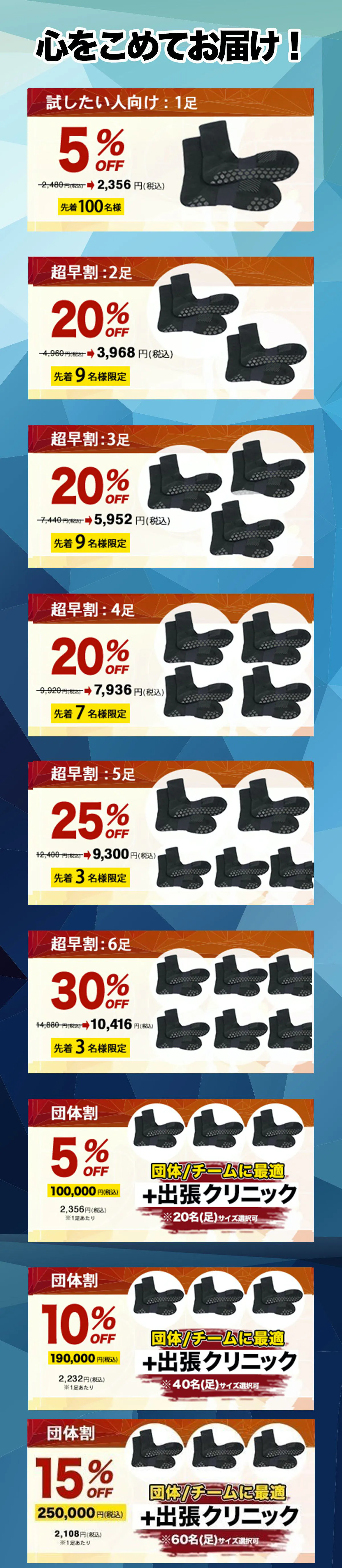 クラウドファンディングを通じて、皆様には特別な価格でこのソックスをまずは試していただきたいです。また団体割引もご用意しております。