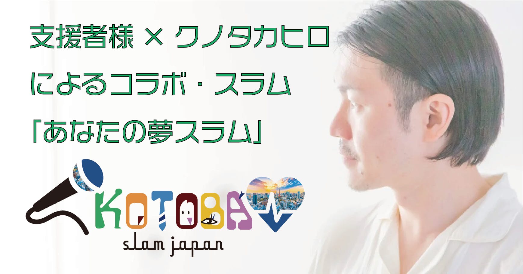 KOTOBA Slam Japanは、日本ではまだ一般的には馴染みのないポエトリーリーディングをはじめとした言語表現パフォーマンス、そして「スラム」文化を一人でも多くの方に知ってもらい、楽しんでほしい。その気持ちを元に、非営利にて行われているプロジェクトです。