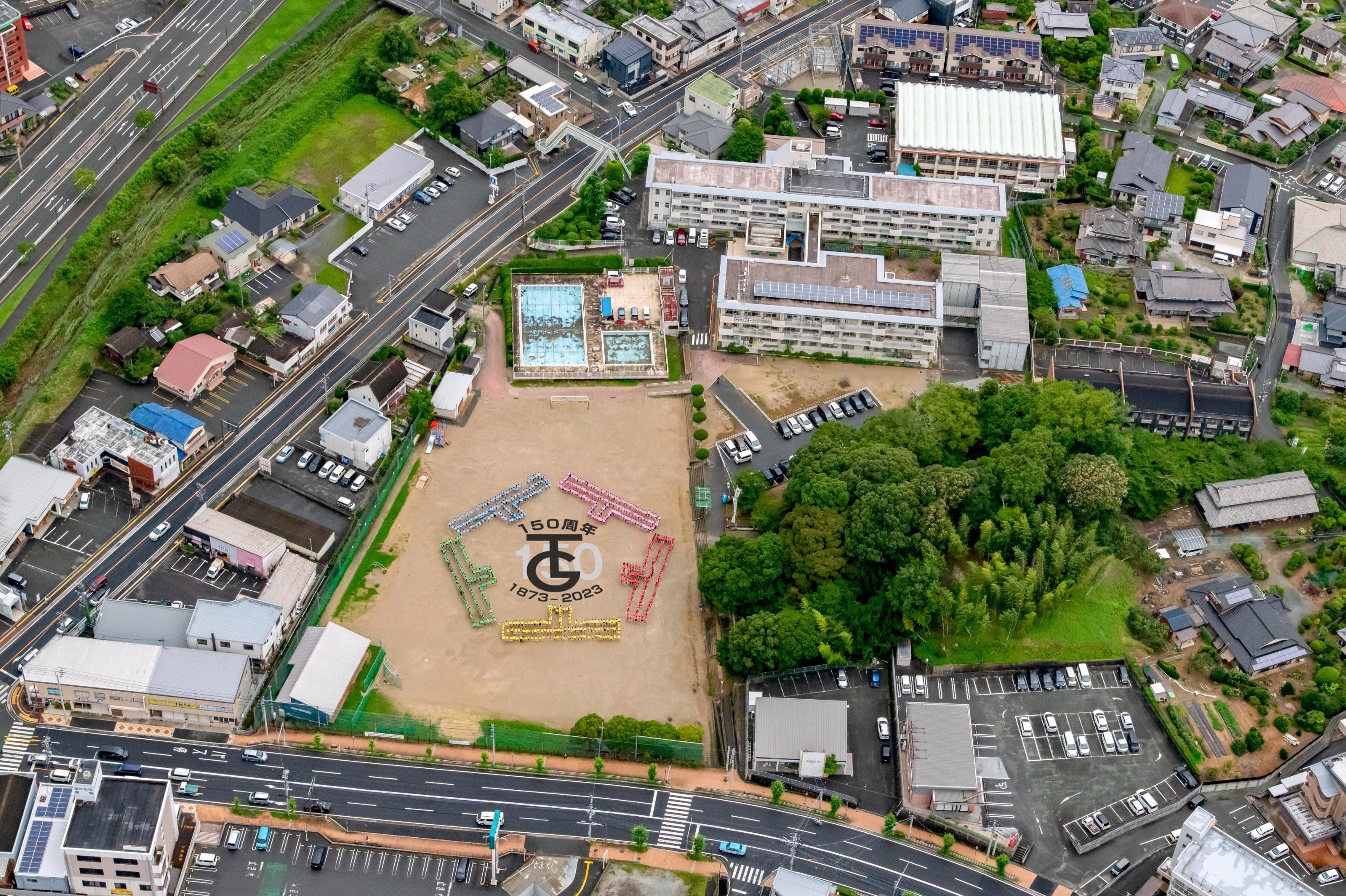 私共は150周年祭実行委員会を組織し、児童から募集した記念ロゴマークとスローガン「東郷小150年の歴史〜みんなでつなげよう未来へ!!〜」を掲げ、式典部会・記念事業部会・祝賀会部会・資金調達部会がそれぞれに活動を行っております。記念事業として人文字の空撮や数回の告知イベントを行ってきました。