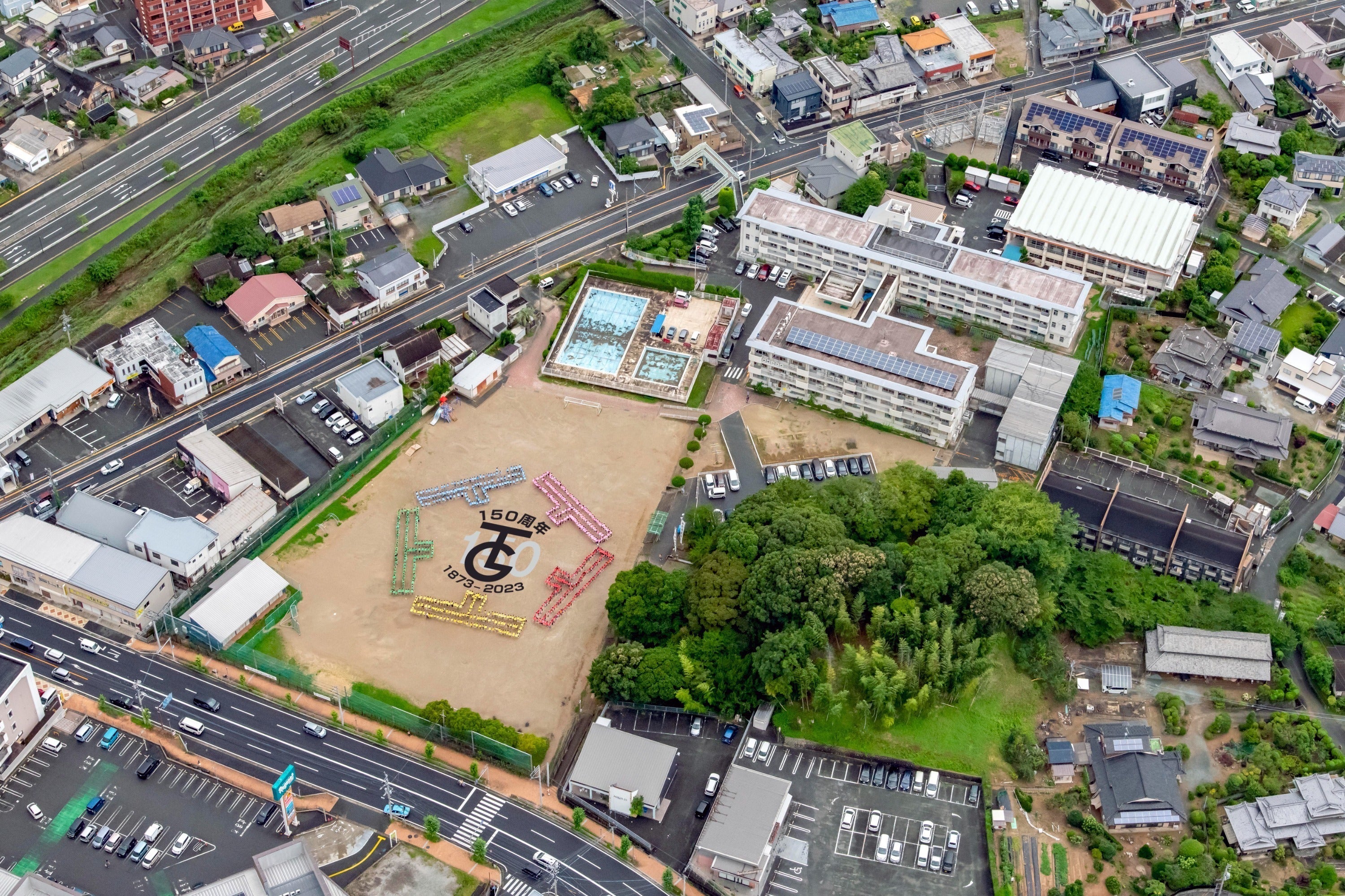 私共は150周年祭実行委員会を組織し、児童から募集した記念ロゴマークとスローガン「東郷小150年の歴史〜みんなでつなげよう未来へ!!〜」を掲げ、式典部会・記念事業部会・祝賀会部会・資金調達部会がそれぞれに活動を行っております。記念事業として人文字の空撮や数回の告知イベントを行ってきました。