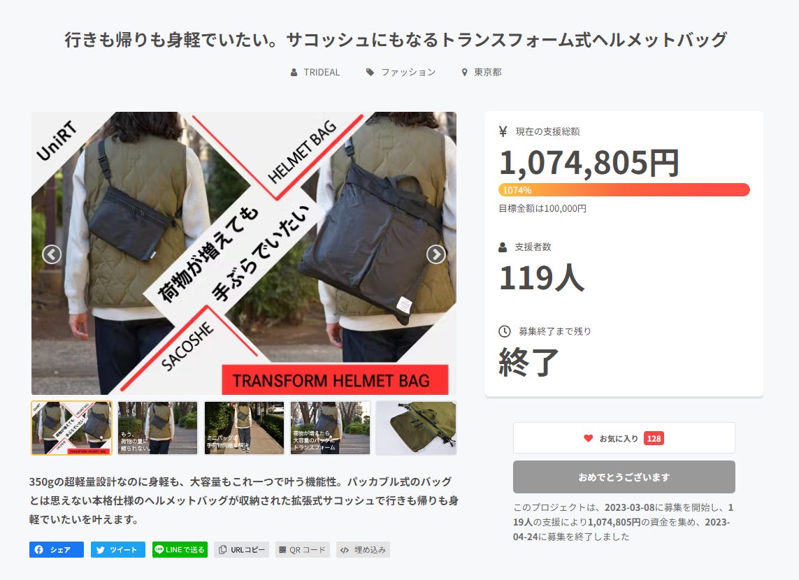 TRANSFORM HELMET BAG(CAMPFIRE)※TRIDEALが運営する別ブランドでのプロジェクト
