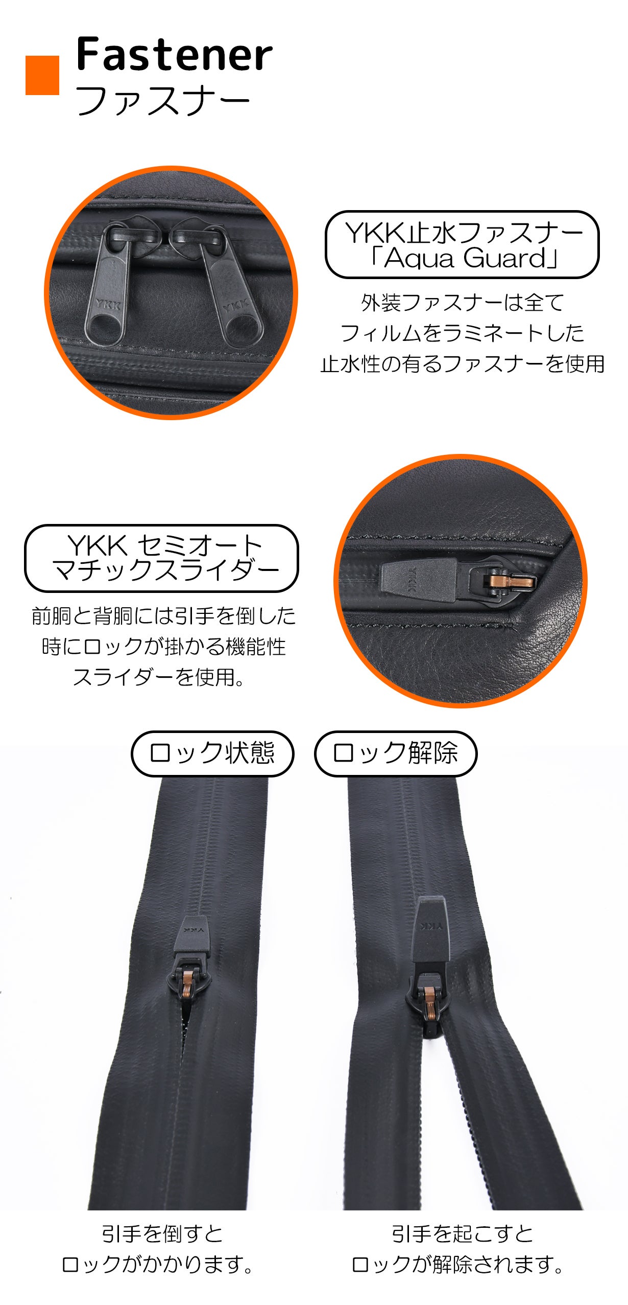ロック機能付きの引手なので、意図せずファスナーが開く心配も御座いません。