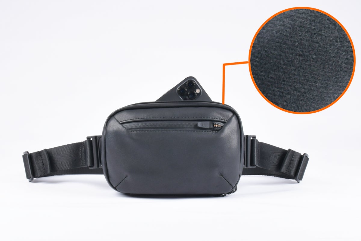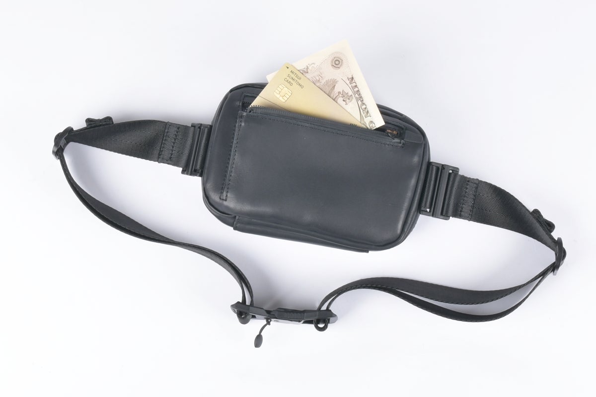 体に接する側には、ファスナー付きのウォレットポケットを配置。