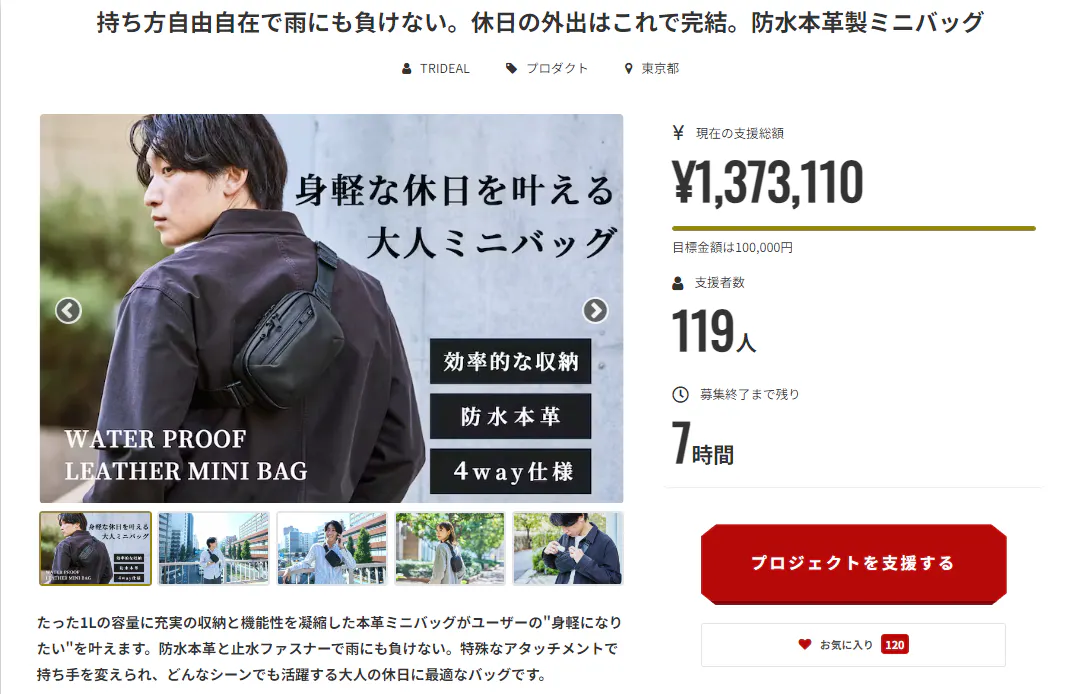 10/24から始まったウォータープルーフレザーミニバッグのプロジェクトもとうとうラスト6時間になりました!