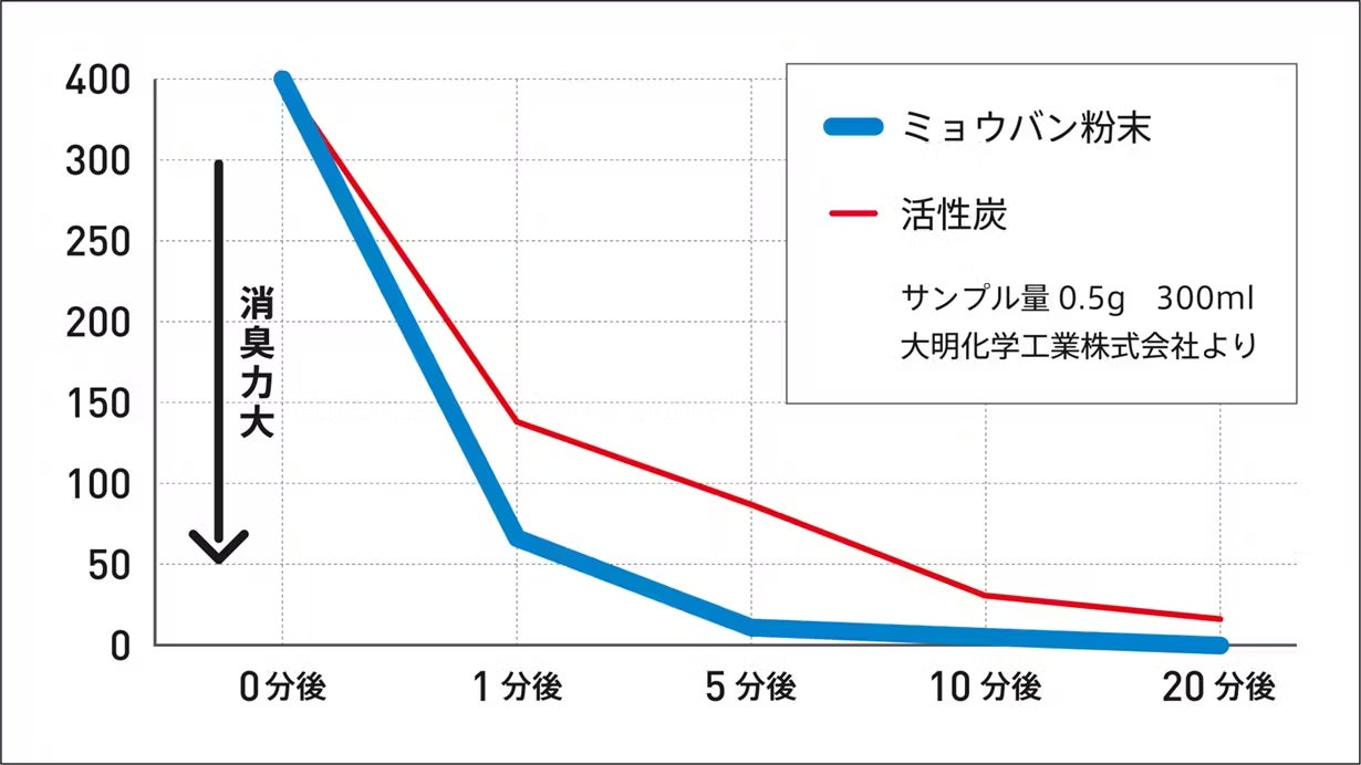 ※大明化学工業株式会社社内テストデータ(サンプル量0.5gを300ml容器内でアンモニアガス濃度を測定)