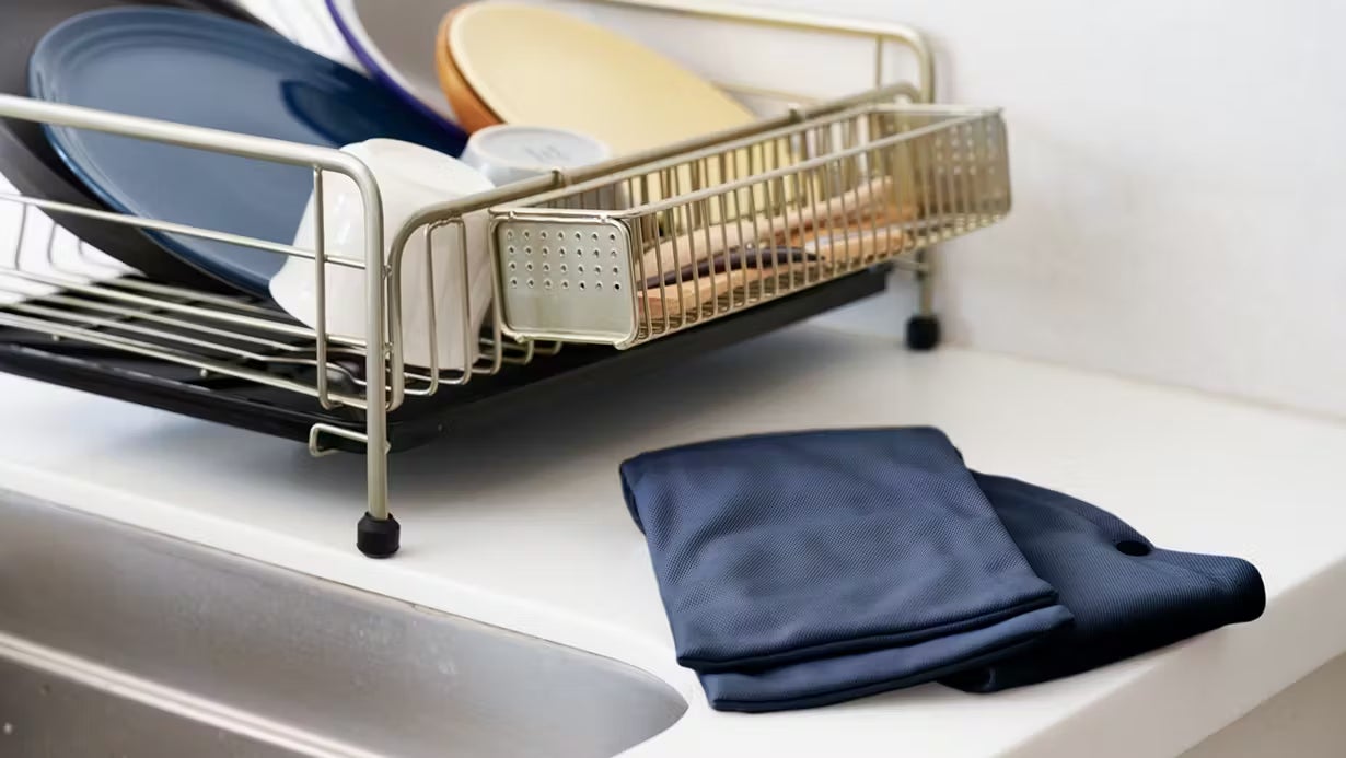 こんなキッチンあるある。やわらか珪藻土ハンドタオルがあれば、何度使っても3分でさらり快適! しかも抗菌力&消臭力を備えているので、衛生的にも安心。