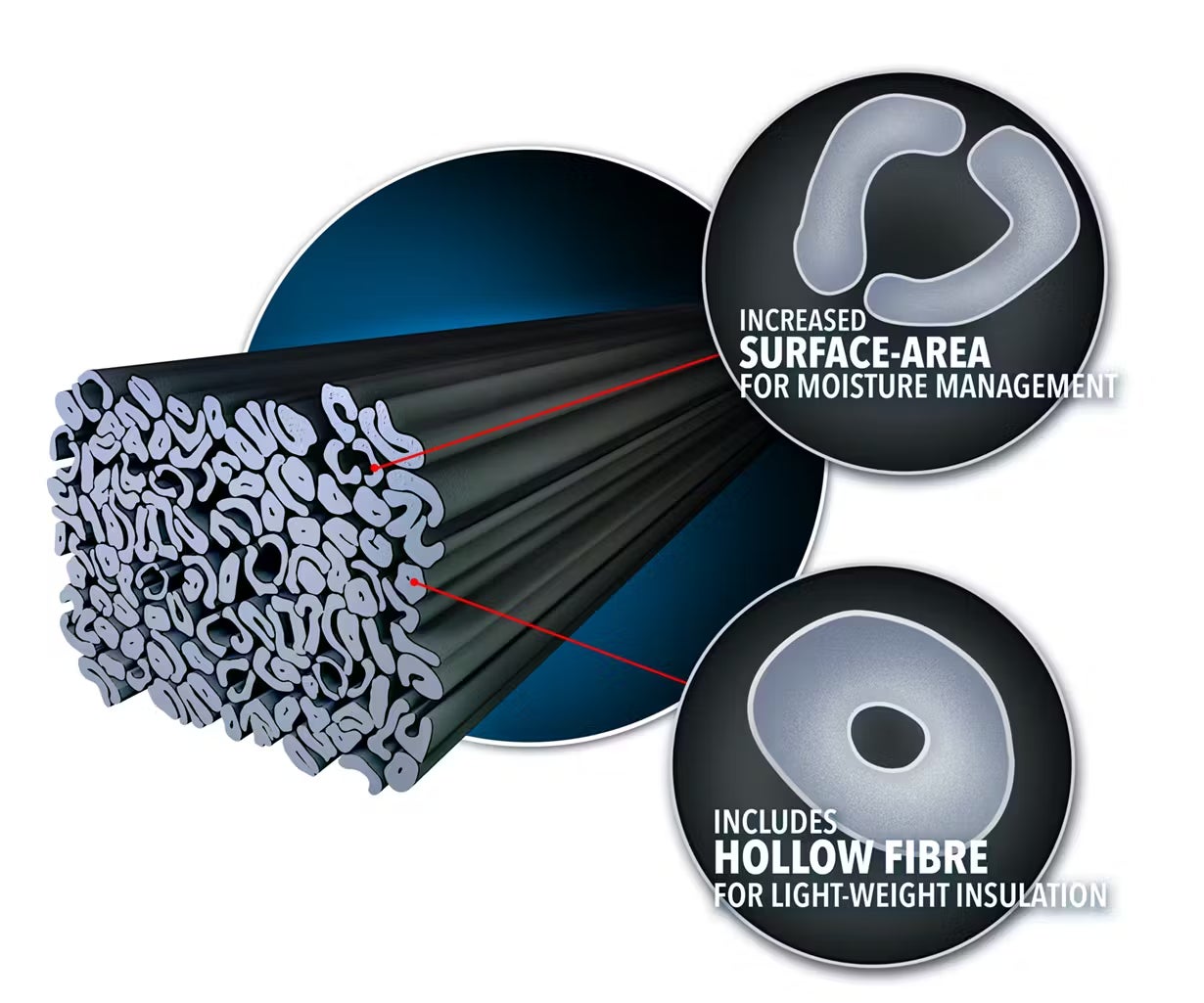 COOLMAX®️EcoMade Fabric は、1本の繊維の中に4つの溝を持つポリエステル製の異型断面繊維です。通常の繊維と比べてその表面積が大きいため、湿気の蒸発が早くなります。また毛細管現象が起きやすく、内側の水分や湿気を素早く蒸散します。