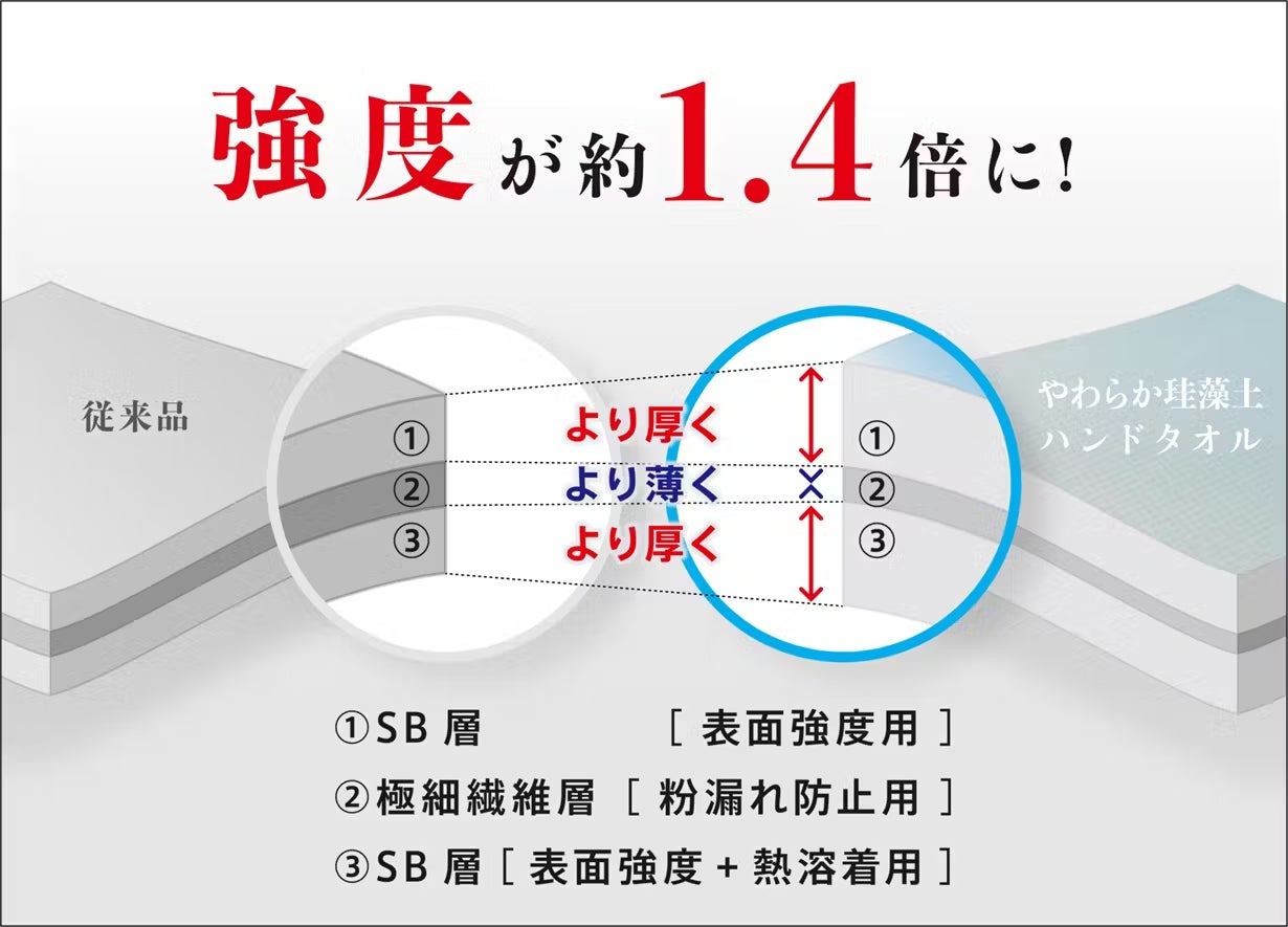 本製品は耐久性を高めるため不織布各層の厚み比率を 2.5 : 1 : 2.5 とし、表面のSB層を厚いものを使用することで強度の向上を図りました。