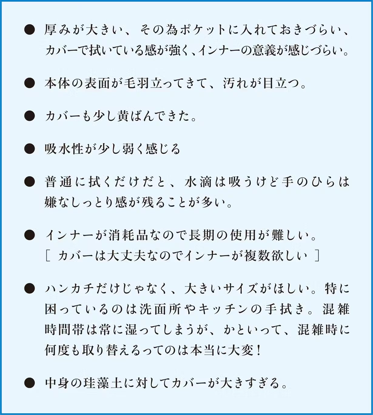 ・コロナ以降、ハンカチを日に3枚は使うようになりました。珪藻土ハンドタオルでこれを解消したいと思います。