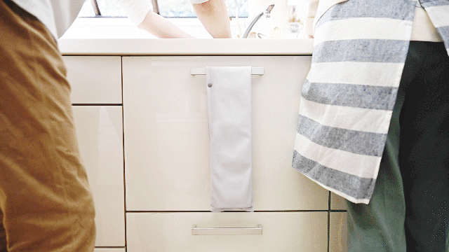 幅を細身にすることで、タオルラックに掛けやすくしました。無地でシンプルなデザインのため、どんなキッチンにも馴染みます。