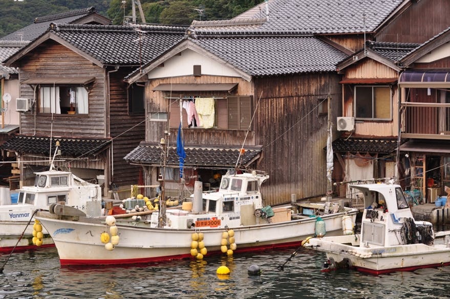 左:伊根湾を周遊する遊覧船 右:伊根の街並み