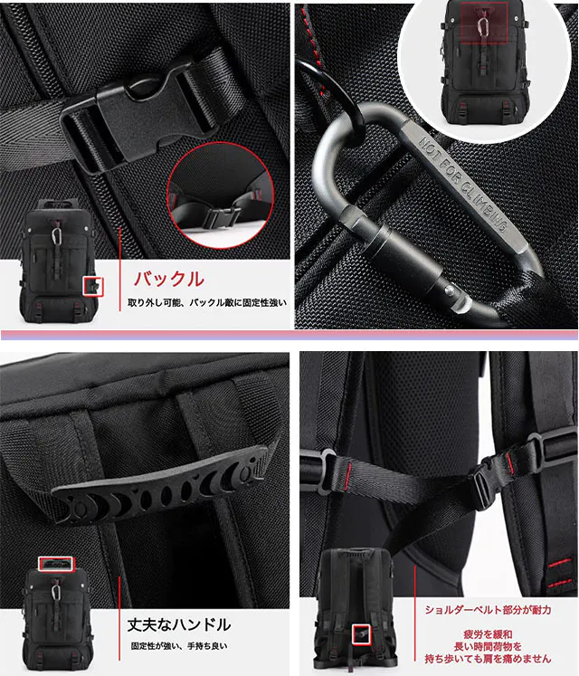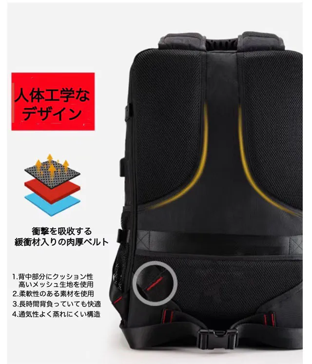 キャンプや登山、スキー道具、旅行であれば4~6泊分の荷物が軽々と入ります。多数ポケットがあり、独立した靴ポケットを設置し、空間分別収納実現、大人靴が一足分入ります。登山や旅行、運動時などに予備の靴を持ち歩くことで、便利です。また、普段の暮らしで、汚れされたものもしくは濡れたタオルをご利用可能です。