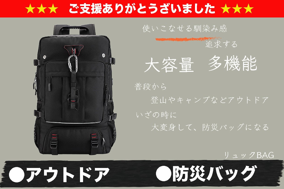 アウトドアバッグでありながら、いざの時に防災バッグとして活躍していただける大容量・多機能リュックバッグです。