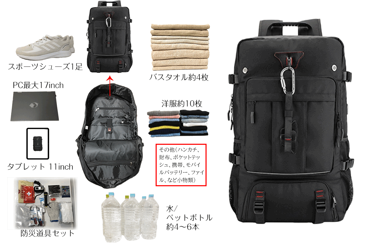 ★もしもの時には防災バックに!小物、貴重書類、着替、防災道具、靴までが入る多機能性バックパック!