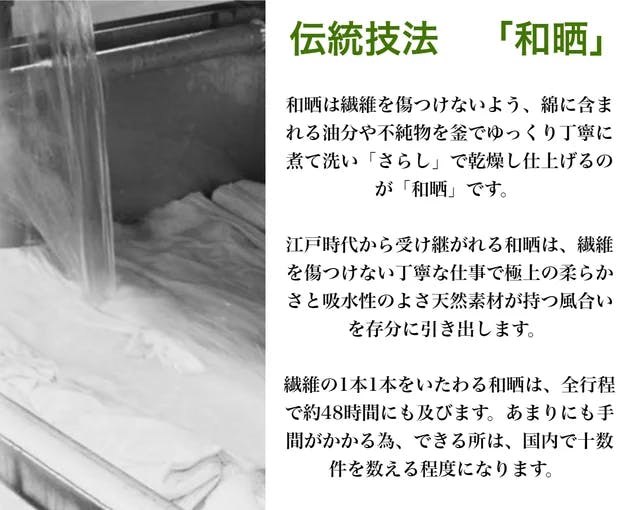 和晒は繊維を傷めないよう、生地をゆっくり丁寧に洗って不純物を取り除くことで、綿が本来持つやわらかさと肌あたりの良さ、素材の力を存分に引き出します。