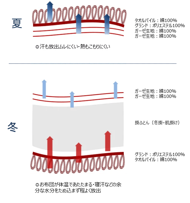 和晒京ふたえガーゼは、ふんわりしたガーゼの間に空気をたっぷり蓄えて、汗やムレなどの水分はすぐに吸い取り放湿して、心地いい布団内の温度を保ちます。