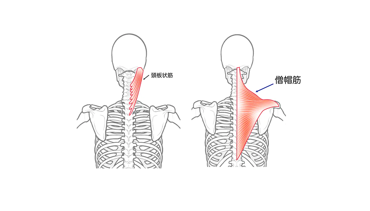 頭と首を支える筋肉の中で代表的なのは、頭の位置を正しく保つ役割をしている、【僧帽筋と頭板状筋】の2つの筋肉です。