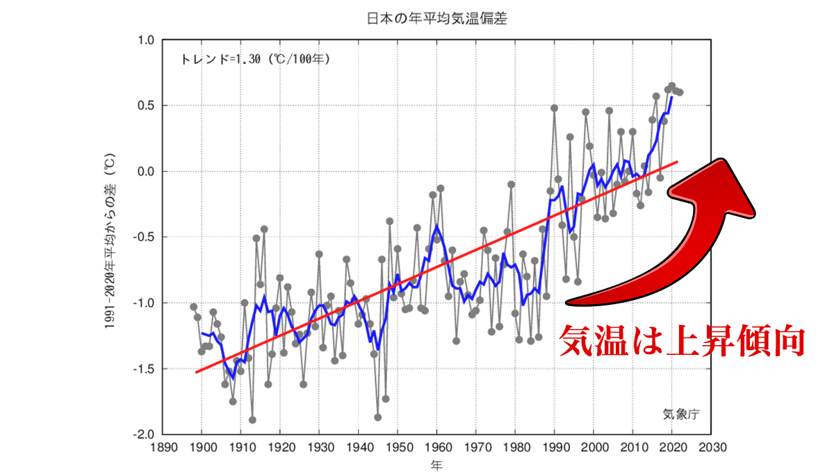 そこには、夏冬問わず日本の”年間平均気温”が年々上昇傾向にあることが言えます。