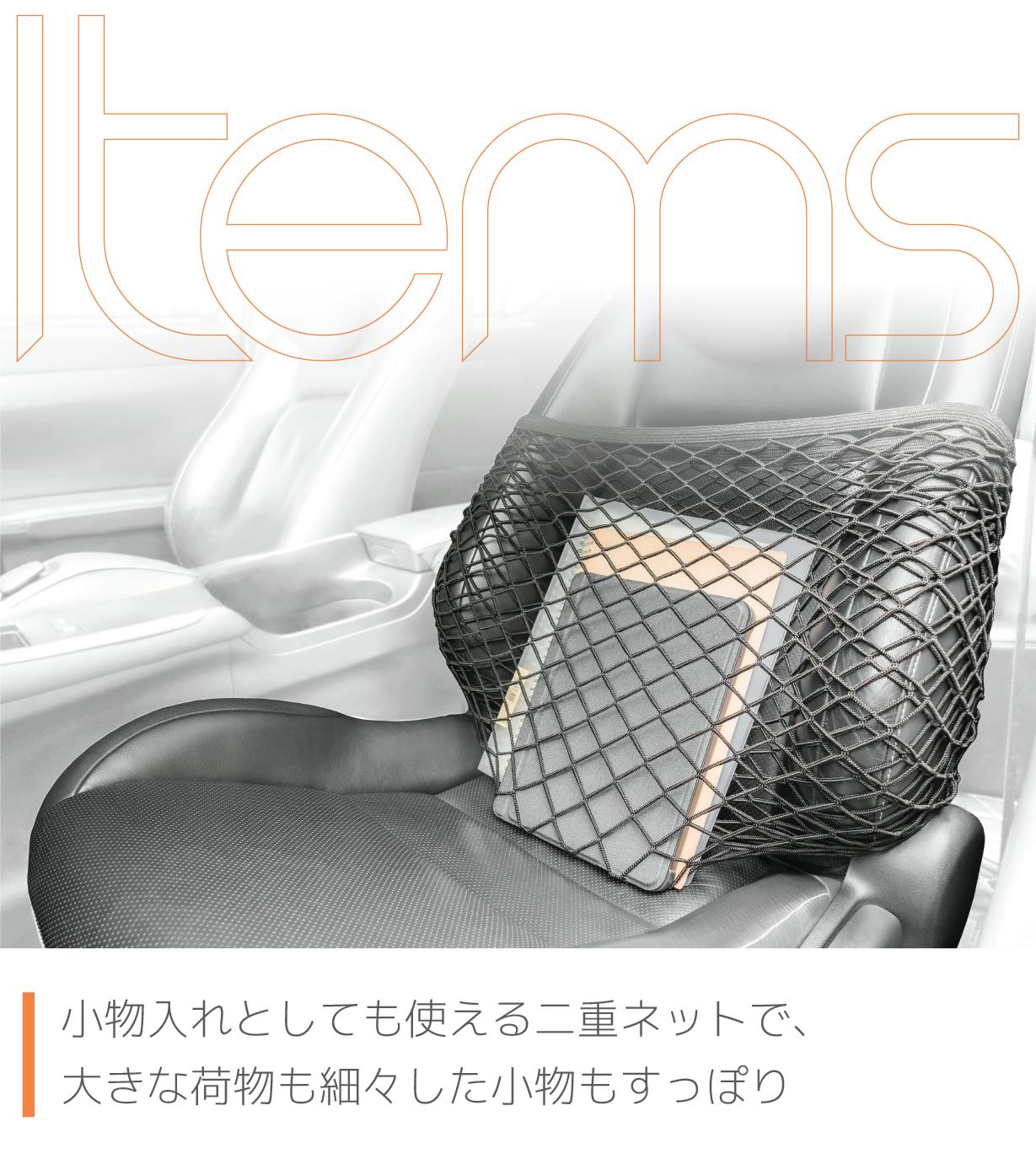この「車内収納カーゴネット」が、車内空間を快適に、そしてあなたの大切な荷物をしっかりと守ります。
