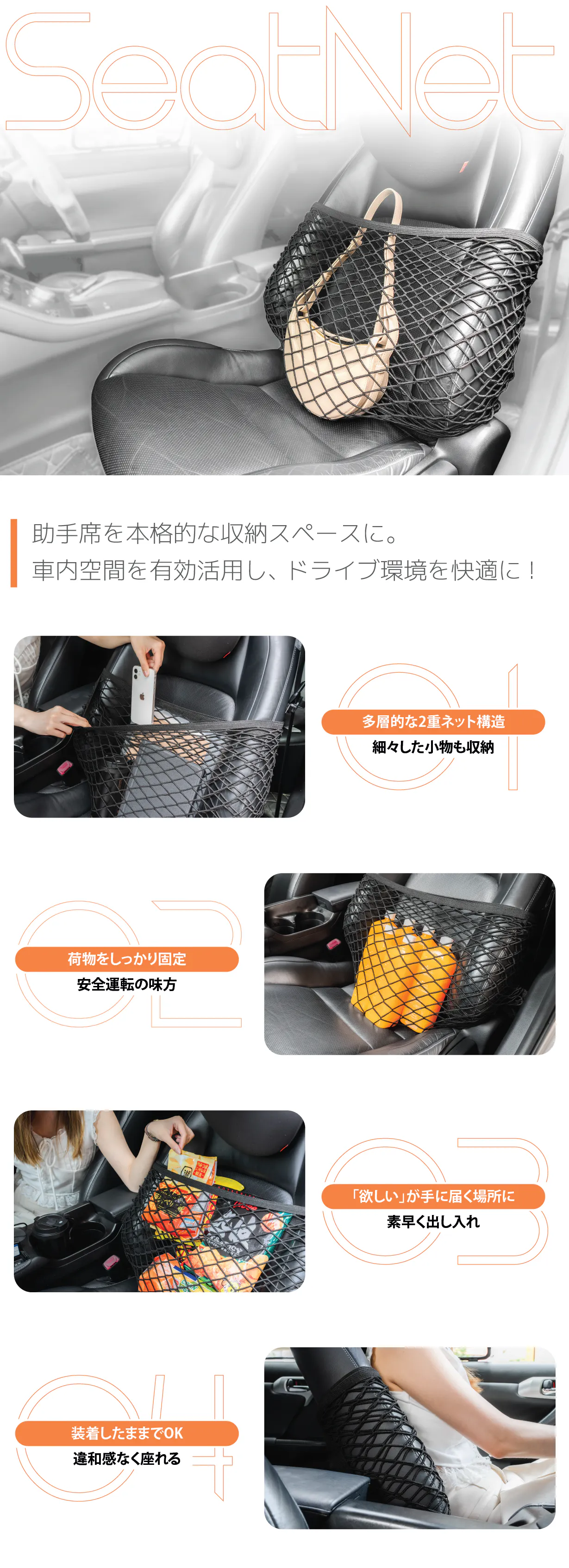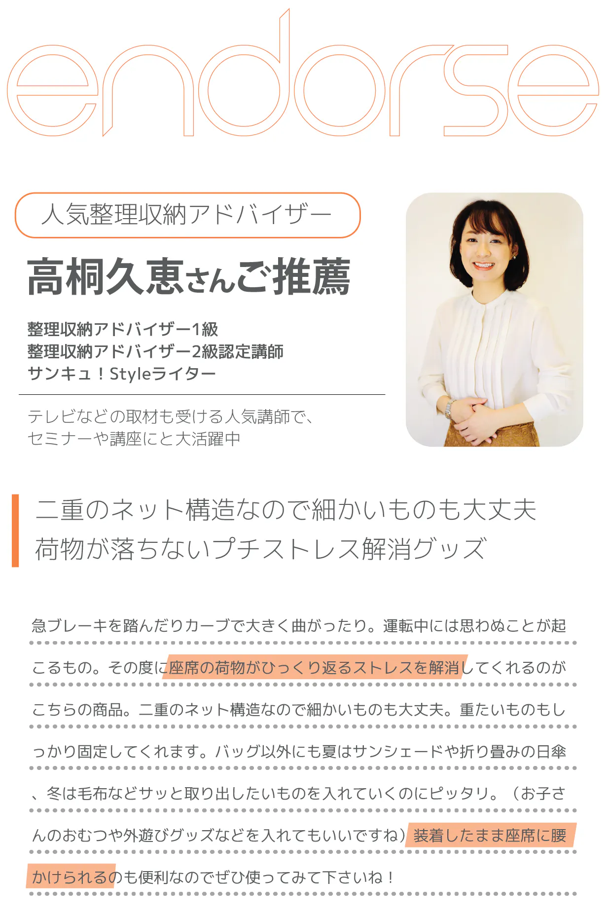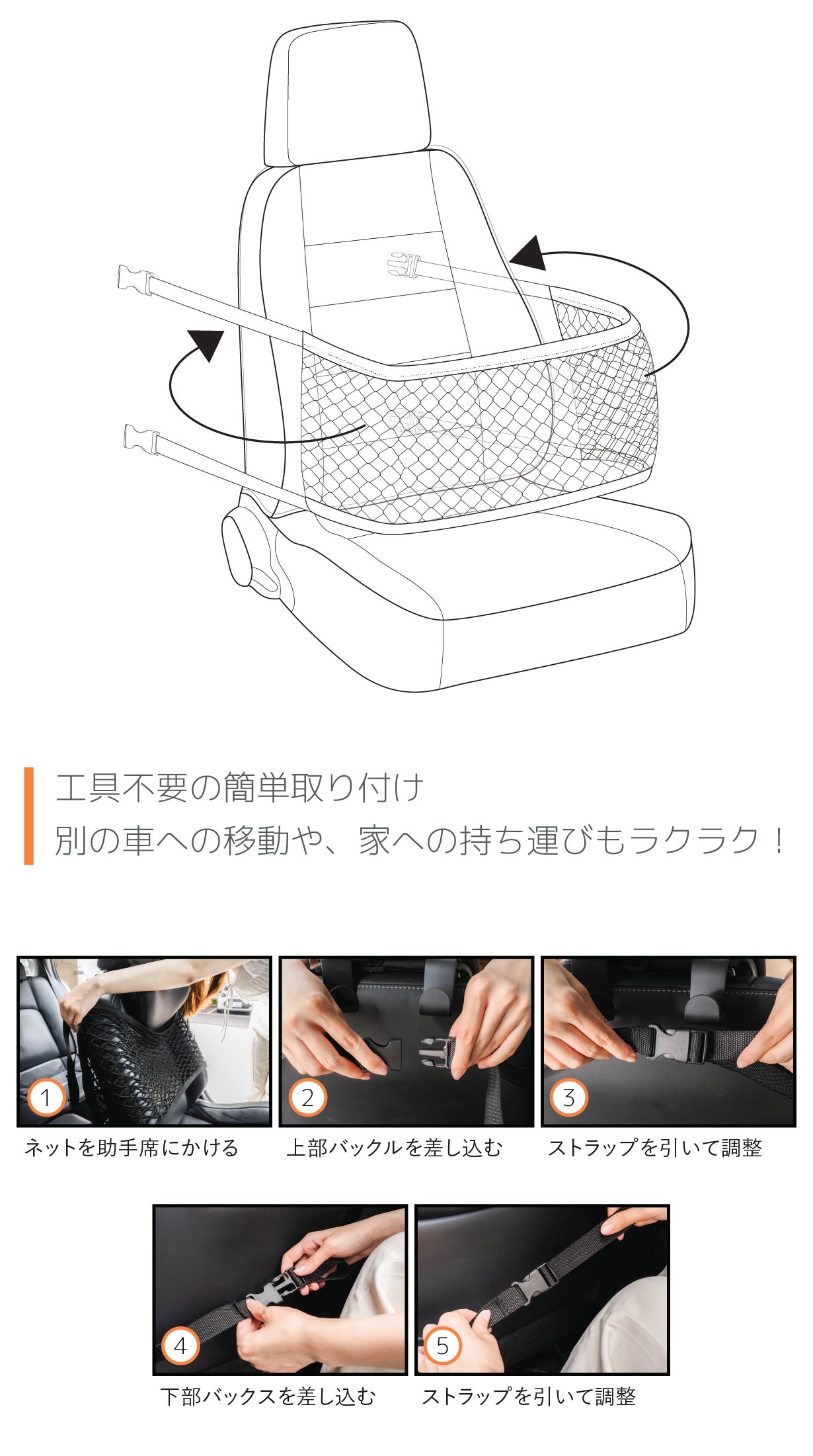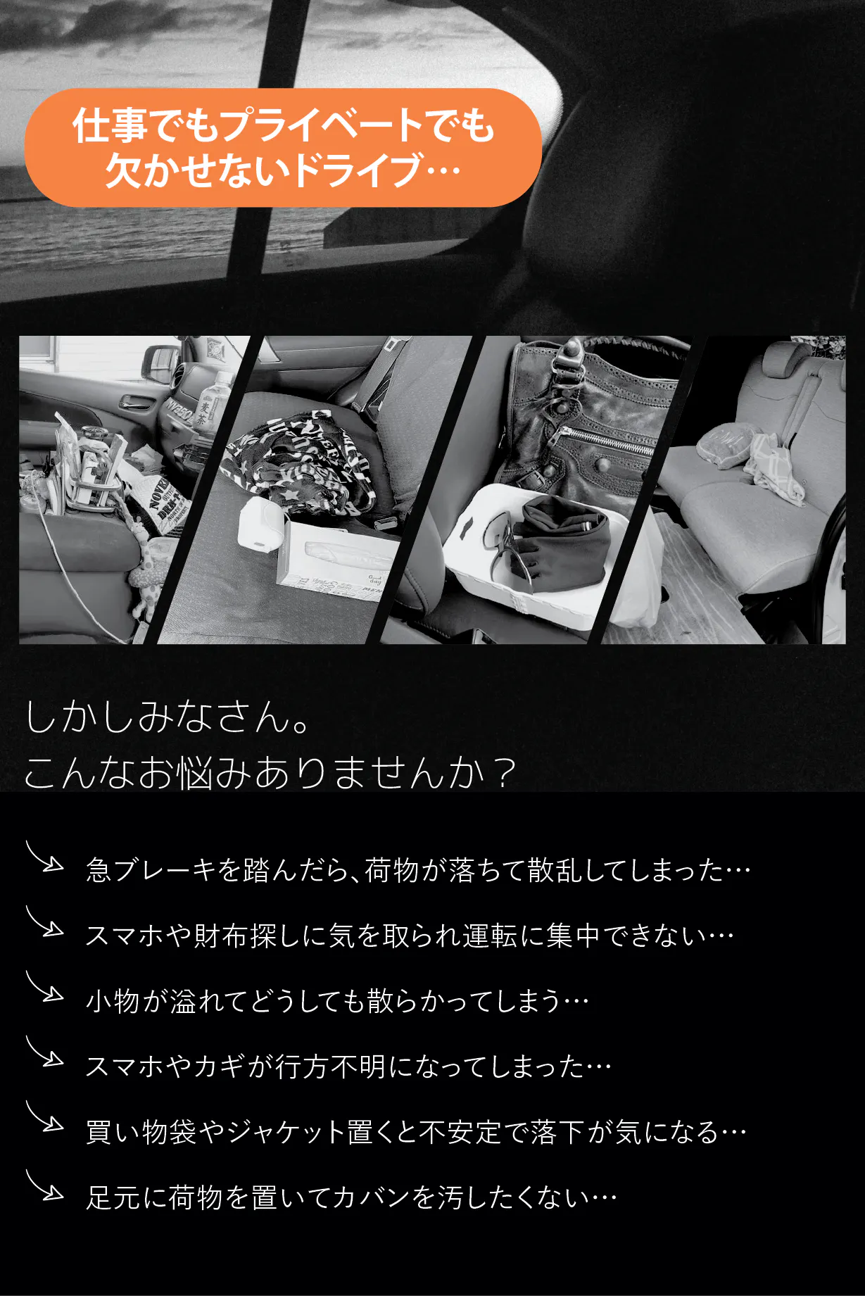 助手席に装着するだけで、運転中に座席から荷物が落ちてしまう“あるある”を解消。