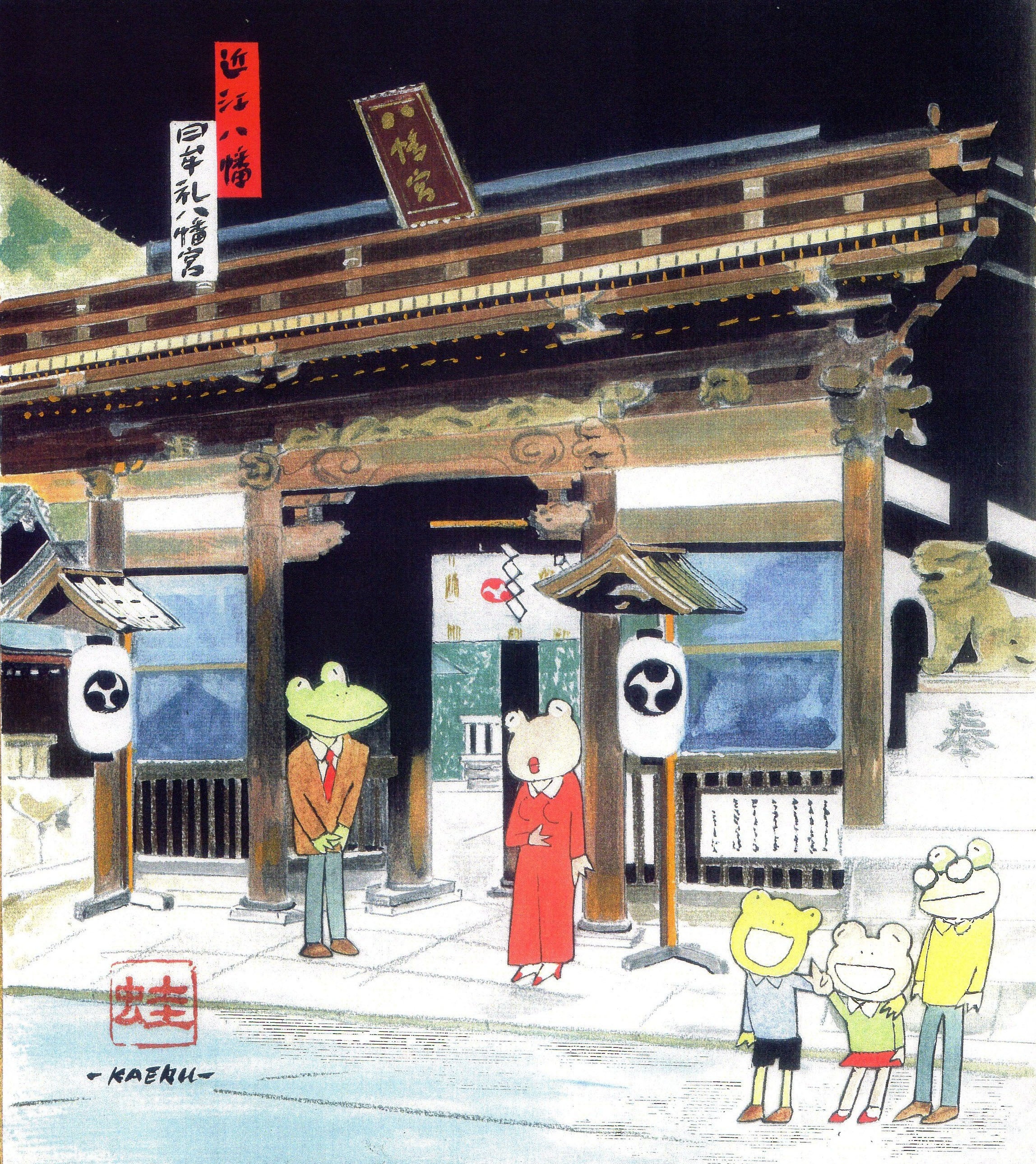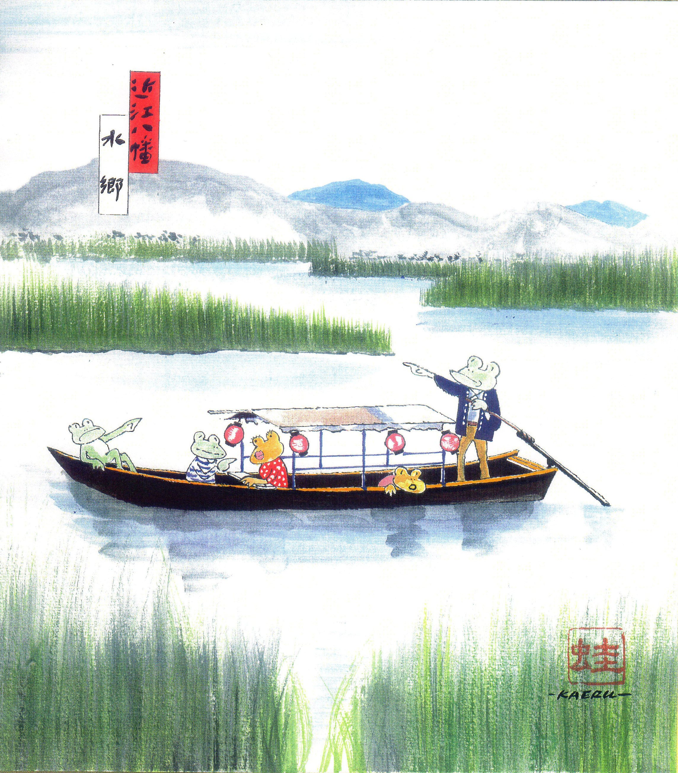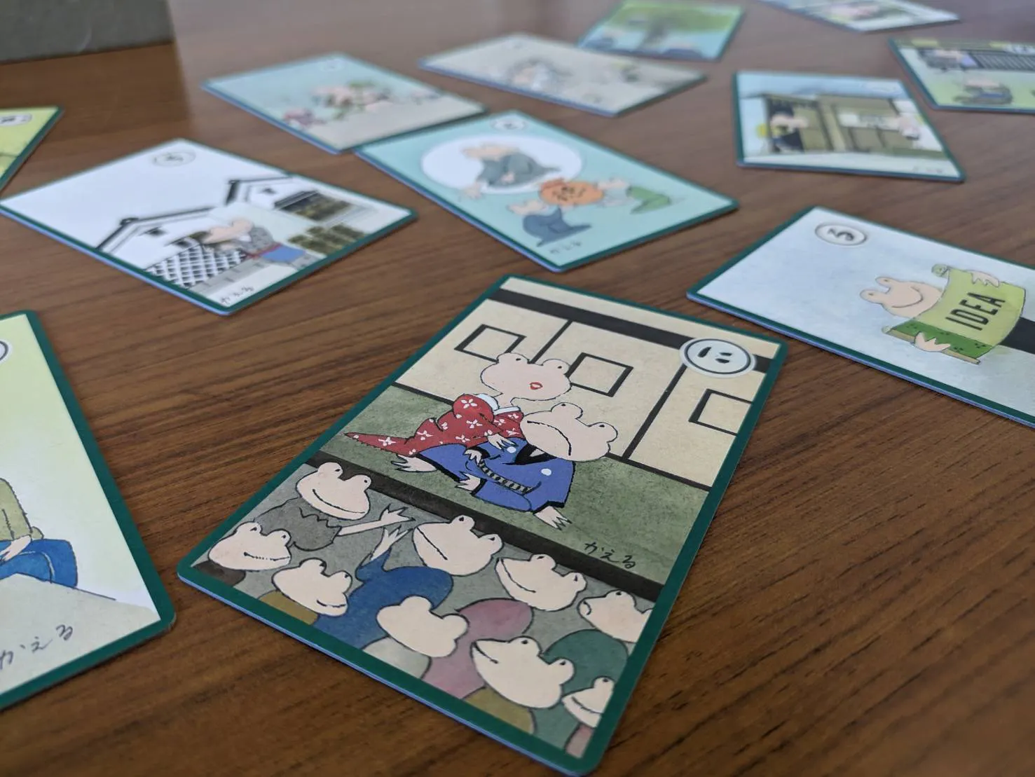 カルタの絵と書は、近江八幡出身のジャズ漫画家 木川かえるが担当しています。かえるを擬人化したユーモアあふれる画風で、大人からこどもまで遊びながら学べるカルタですが、今では絶版となっています。