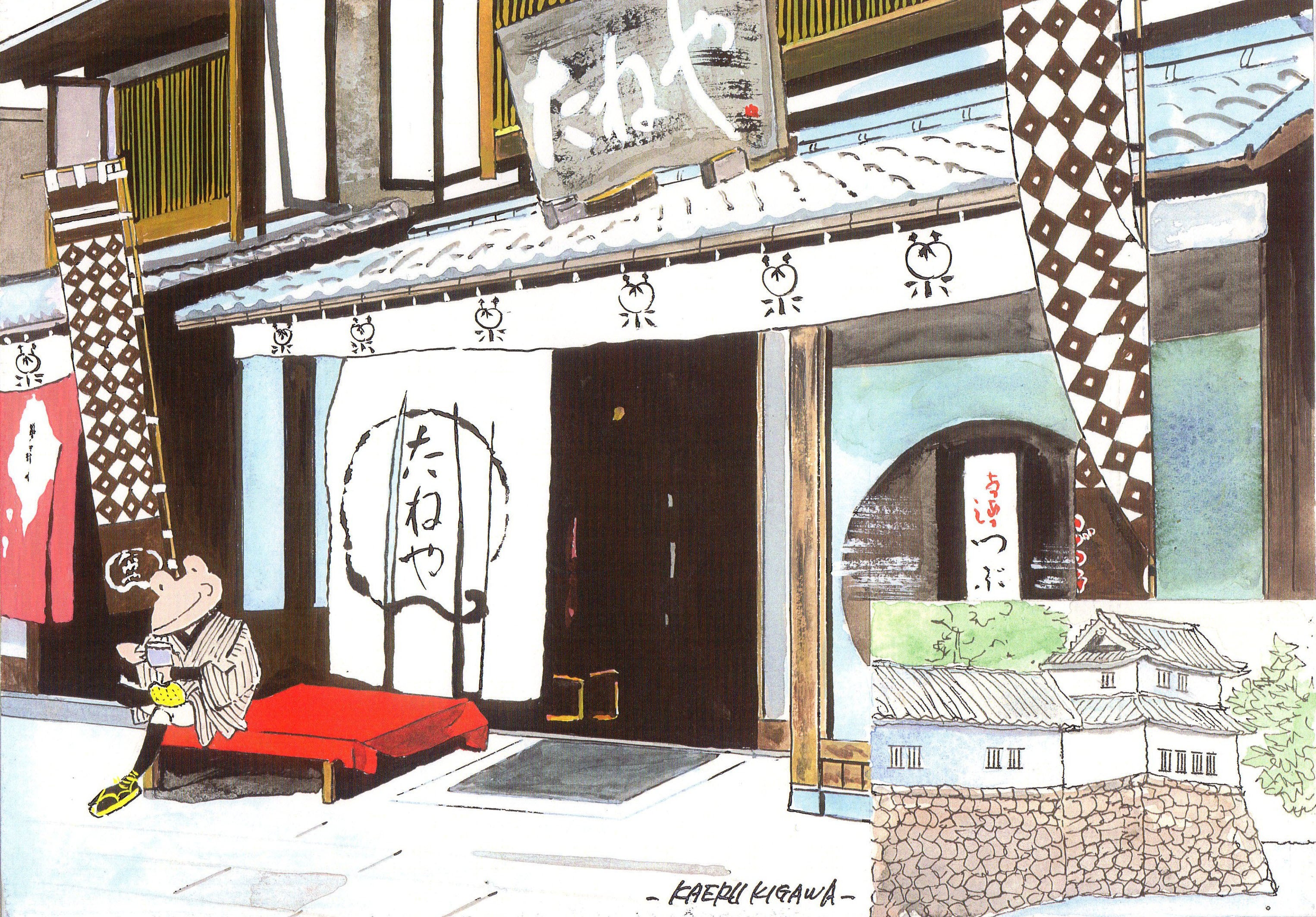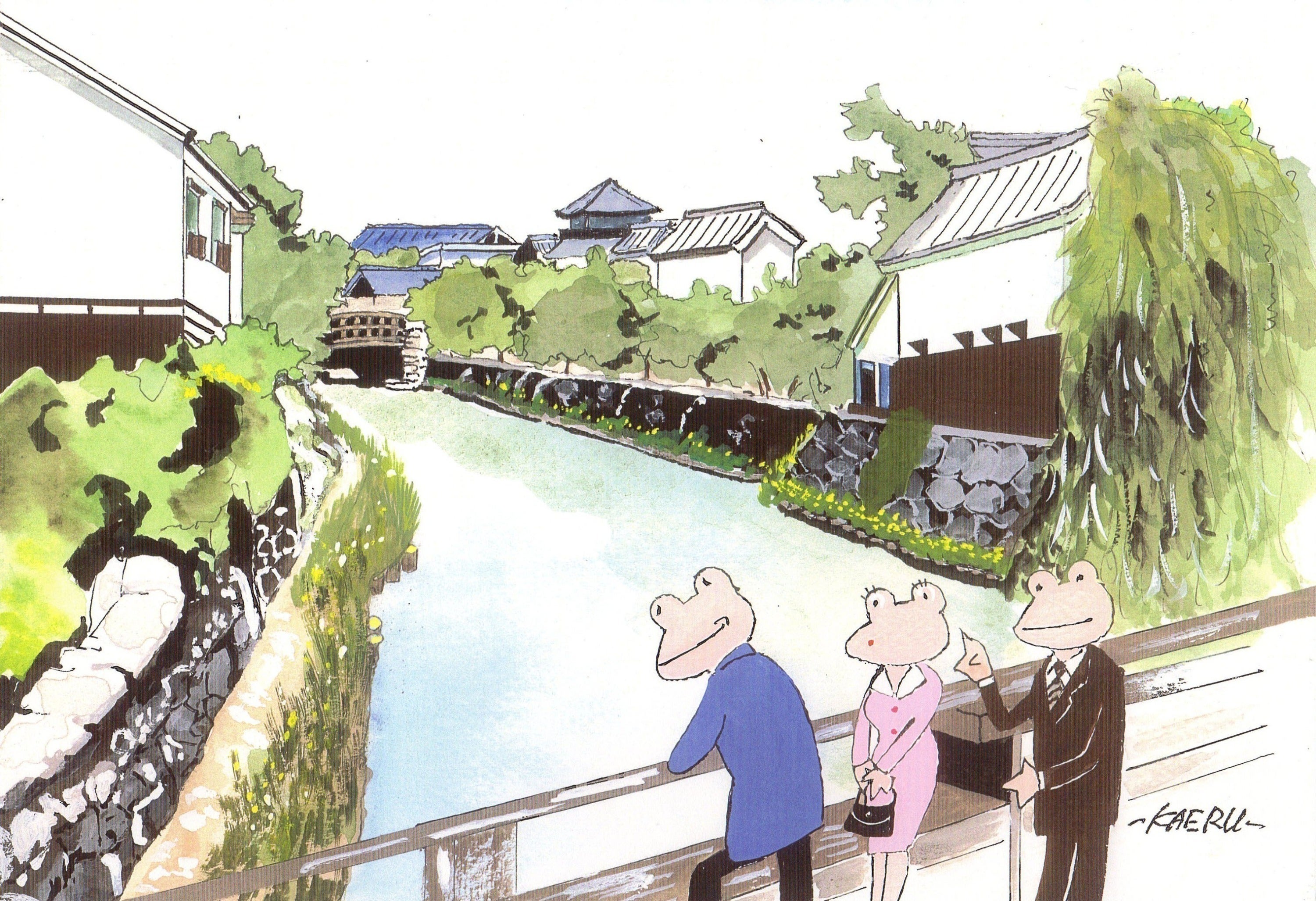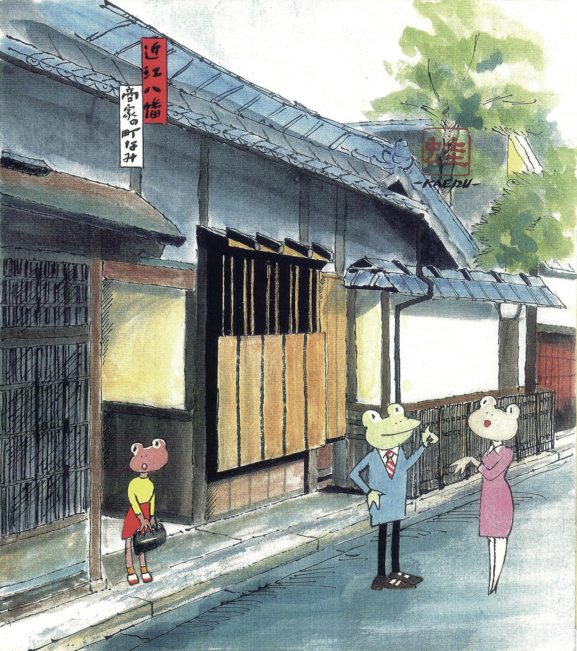 カルタの絵と書は、近江八幡出身のジャズ漫画家 木川かえるが担当しています。かえるを擬人化したユーモアあふれる画風で、大人からこどもまで遊びながら学べるカルタですが、今では絶版となっています。