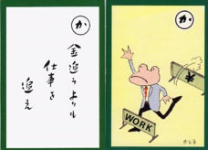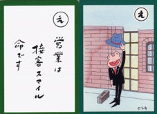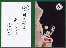 近江商人はじめ先人たちが伝え残してくれた家訓・掟・心得など商いをする上で大切なことや伝統などを、一般公募や八幡商業高等学校の生徒さんからの応募と「船場カルタ」や「専門店いろはカルタ」の引用から46点の札にまとめ、木川かえるが絵と書を添え完成したカルタです。企画発行は小さな文化を作る会、2001年10月30日に初版1000部限定で発行されました。