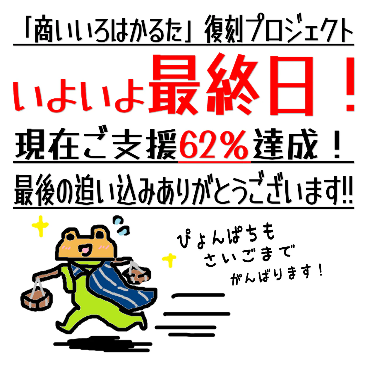 2024/01/26 09:04皆様にご支援を賜り、とうとう目標の60%を突破いたしました!本当にありがとうございます‼いよいよファンディング期間も本日まで。最後まで達成目指してがんばります !カルタもステキに仕上がっています。ぜひご支援ください! もっと見る