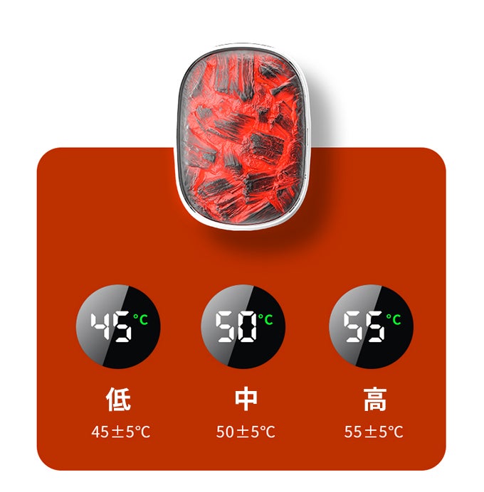 45℃、50℃、55℃の3つのモードを搭載し、周囲温度に応じて自由にお選びいただけます。屋内では45℃、雪が降る屋外では55℃がお勧めです。もう寒さを恐れない!