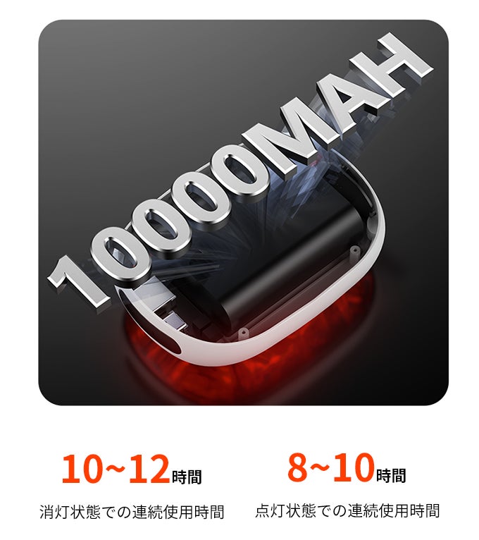 10000mAh大容量バッテリーにより、消灯している場合45℃モードで約12時間の連続発熱ができます。また、バッテリーの残量をいつでもディスプレイで確認可能なため、タイムリーに充電することができます。