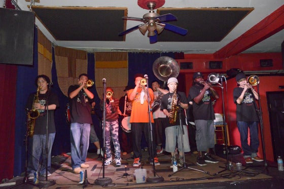 話の順序が前後しますが、ニューオリンズで出演したイベントをもうひとつご報告します。ラジオに出演した日のラストイベントはIZAKAYA YUKIではなく、実は急遽出演が決まったThe Howlin' Wolf Denでの演奏だったのです。 この日はなんと4件ハシゴしたわけです。そのうち2件は急遽出演させて頂いたイベントで、この出演が決まったのも、ブラスバンドのイベントがあるから見に行こうと、YUKIのライブの後フラッと遊びに行ったところ、「お前らもやっていけよ!」という感じで誘って頂いたのです。 この時、ベースドラムの横山が不在だったのですが、なんとEllis "EJO" JosephというFree Agent Brass Bandのリーダーが手伝ってくれました。そして、そこに居合わせたトロンボーンのTyrus Chapmanもシットイン。彼はその後のBlue Nileでのライブレコーディングにも参加してくれました。 4件目のシメに豪華なゲストを迎えて、2人のプレイに刺激を受けながらの演奏は、ニューオリンズという街に自分達の居場所があることを感じさせてくれるような、そんな気持ちを抱いたイベントとなりました。