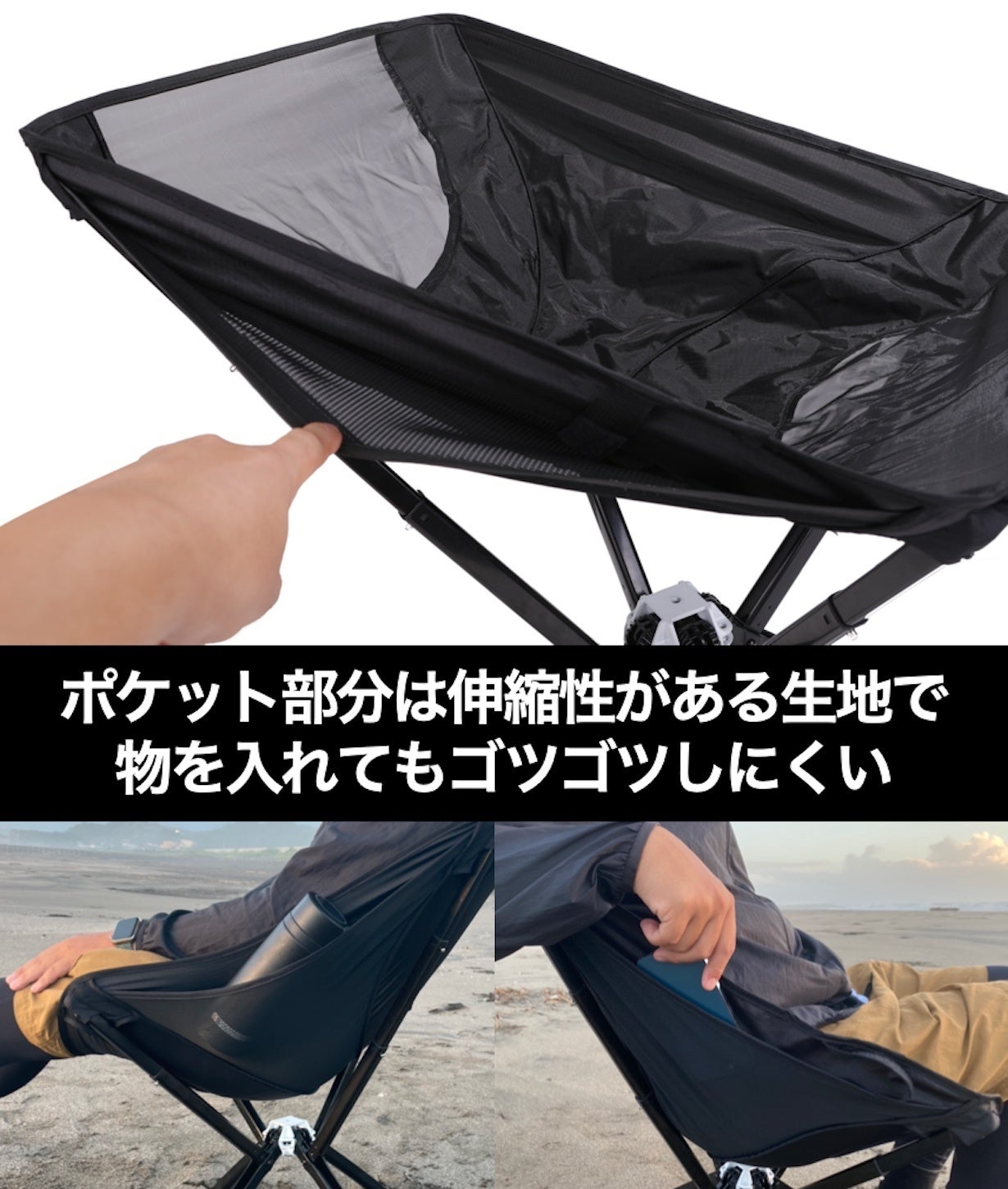 ゆったりシートで身体をスッポリ包み込み、ポータブルチェアとは思えない座り心地を実現!